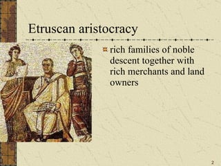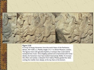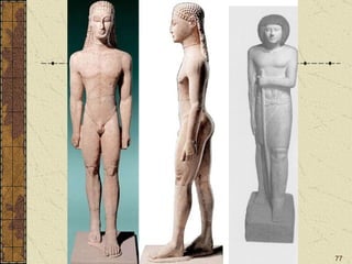 The document summarizes aspects of ancient Greek art and culture from 700 BCE to 30 BCE. It describes the Etruscans who lived in northern Italy from 950 to 300 BCE and influenced early Rome. It then covers the classical style in Greece which emphasized harmony, balance, humanism, and idealism. Finally, it discusses various genres of Greek art including pottery, sculpture, and architecture during the Archaic, Classical and Hellenistic periods.