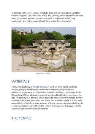 Greek architecture, spanning from c. 900 B.C.E. to the first century C.E., is recognized for its distinct buildings like temples and theatres, which influenced architectural styles in the Roman world and beyond. The Parthenon symbolizes Greek culture, while five classical architectural orders formed the basis of Western architecture. Notable contributions include the amphitheatre and stadium, showcasing the evolution of public structures from wood to stone, and an enduring impact on modern design.