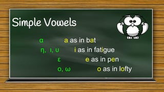 The document provides an overview of Greek vowels, simple and double consonants, and their pronunciation. It includes tasks for practicing matching letters, reading syllables aloud, and understanding pronunciation rules for letter combinations. Additionally, it emphasizes the sounds associated with various Greek letters through examples.