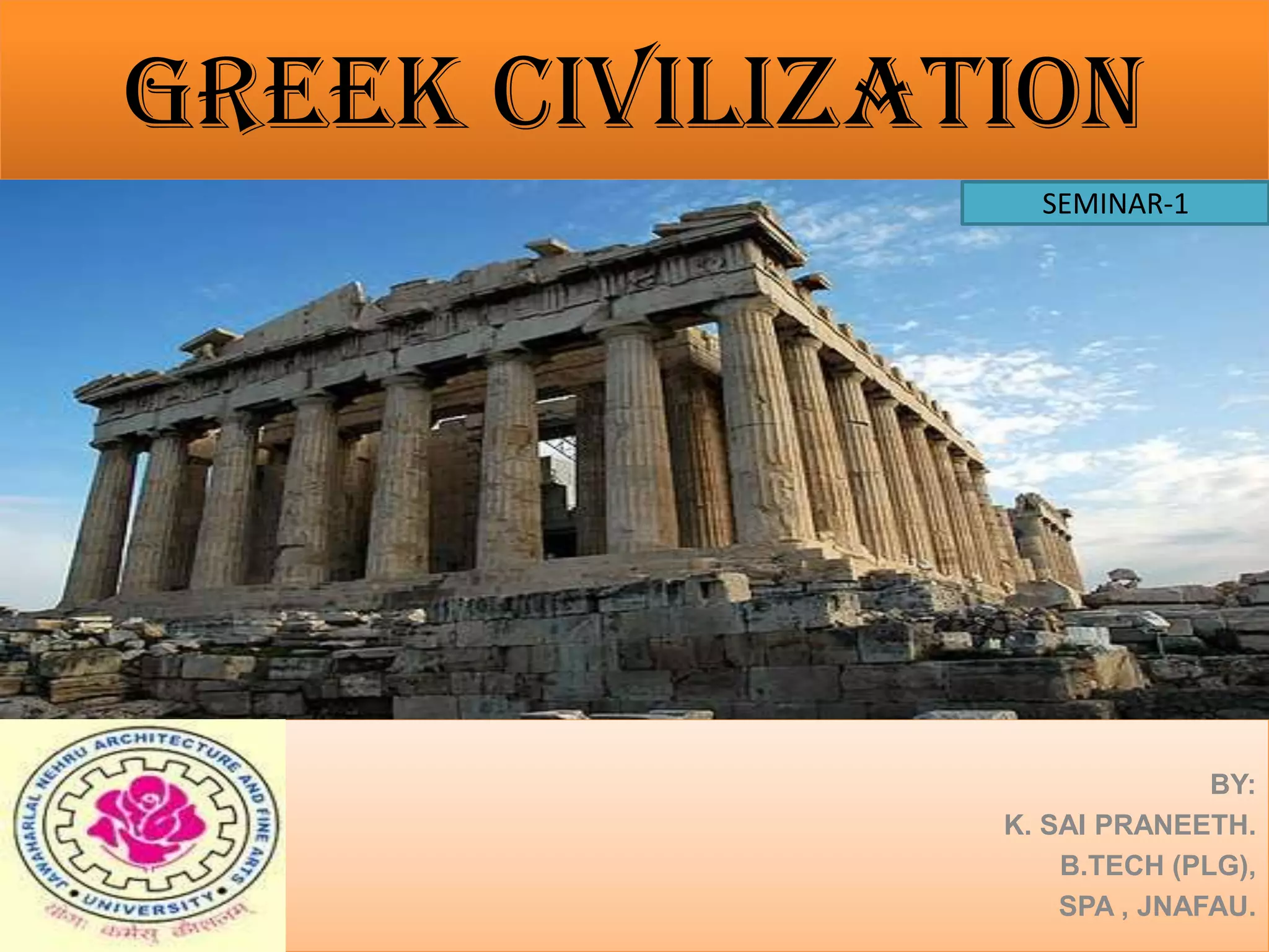 This document provides an overview of ancient Greek civilization from 2000 BC to 300 BC. It covers the history, geography, colonies, culture, city-states, politics and society of ancient Greece. The geography of Greece, with its mountainous terrain and many islands, led to the development of independent city-states. Greek civilization made important contributions to democracy, literature, philosophy, science and mathematics. The Olympics also became a central part of Greek culture and helped unite the Greek people. While short-lived, ancient Greek civilization had a profound influence on Western culture.