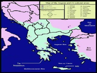 Greek civilization flourished between 1000 BC to 323 BC, originating in areas settled by ancient Greeks like the Greek peninsula, Cyprus, and parts of modern-day Turkey. It was characterized by the rise of independent city-states like Athens and Sparta, which practiced different forms of government. Athenian democracy and Spartan militarism were dominant. Greek culture had a significant influence on Western civilization through developments in philosophy, drama, architecture, science, and more. The civilization ended with the death of Alexander the Great in 323 BC and the rise of Hellenistic empires.