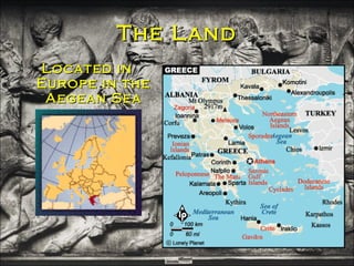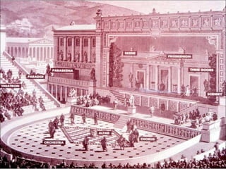 The document summarizes key aspects of ancient Greek civilization from its early history and the emergence of the polis system to its major city-states of Athens and Sparta, art, theater, and influence of philosophers like Socrates, Plato, and Aristotle. It provides details on Greek religion, architecture like the Parthenon, and genres of drama like tragedy and comedy performed in amphitheaters. Major time periods discussed include the Minoan, Mycenaean, Archaic, Classical, and Hellenistic eras of ancient Greece.