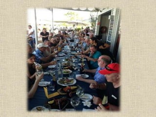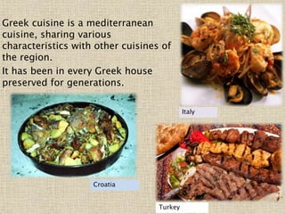 Greek cuisine is a Mediterranean cuisine that has been passed down through generations. It is influenced by its geography and seasonal ingredients available in different regions of Greece. Food and social interaction are deeply ingrained in Greek culture, with meals bringing families and communities together for important events. A traditional Greek diet centers around foods like wheat, olive oil, wine, cheeses, vegetables, fruits, nuts, legumes and seafood, depending on coastal or inland regions. Meals are meant to be enjoyed with others as a social activity.