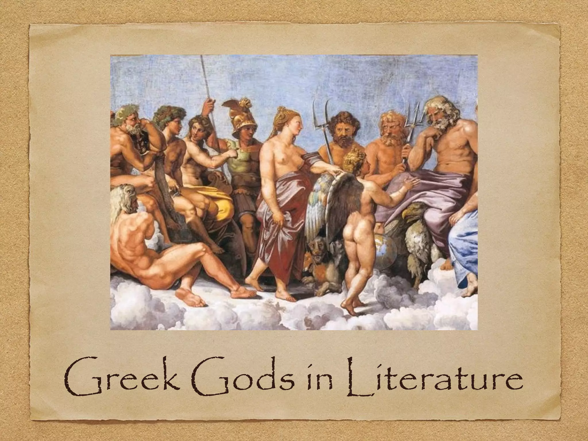 The document discusses several Greek myths involving Greek gods that have been referenced in literature. It provides summaries of poems and passages that reference myths about Leda and the swan, Dionysus, Athena, Venus, Vulcan, Eros, Demeter, Prometheus, and Apollo. The myths are depicted in poems, passages from plays, and descriptions of classical artwork involving the gods.