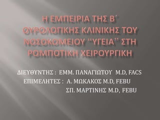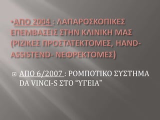 Greek presentation 1. Η ΕΜΠΕΙΡΙΑ ΤΗΣ β΄ ΟΥΡΟΛΟΓΙΚΗΣ ΚΛΙΝΙΚΗΣ ΤΟΥ ΝΟΣΟΚΟΜΕΙΟΥ “ΥΓΕΙΑ” ΣΤΗ ΡΟΜΠΟΤΙΚΗ ΧΕΙΡΟΥΡΓΙΚΗ ΔΙΕΥΘΥΝΤΗΣ : ΕΜΜ. ΠΑΝΑΓΙΩΤΟΥ Μ.D, FACSΕΠΙΜΕΛΗΤΕΣ : Α. ΜΩΚΑΚΟΣ Μ.D, FEBUΣΠ. ΜΑΡΤΙΝΗΣM.D, FEBU 2. ΑΠΟ 2004 : ΛΑΠΑΡΟΣΚΟΠΙΚΕΣ ΕΠΕΜΒΑΣΕΙΣ ΣΤΗΝ ΚΛΙΝΙΚΗ ΜΑΣ (ΡΙΖΙΚΕΣ ΠΡΟΣΤΑΤΕΚΤΟΜΕΣ,HAND-ASSISTEND- ΝΕΦΡΕΚΤΟΜΕΣ)ΑΠΟ 6/2007 : ΡΟΜΠΟΤΙΚΟ ΣΥΣΤΗΜΑDA VINCI-S ΣΤΟ “ΥΓΕΙΑ” 3. 4. 5. ΦΑΣΜΑ ΡΟΜΠΟΤΙΚΩΝ ΕΠΕΜΒΑΣΕΩΝΒ΄ΟΥΡΟΛΟΓΙΚΗΣ ΚΛΙΝΙΚΗΣΕΩΣ ΚΑΙ ΤΟ 2009ΡΙΖΙΚΗ ΠΡΟΣΤΑΤΕΚΤΟΜΗ 245ΡΙΖΙΚΗ –ΑΠΛΗ ΝΕΦΡΕΚΤΟΜΗ 12 ΜΕΡΙΚΗ ΝΕΦΡΕΚΤΟΜΗ 7ΡΙΖΙΚΗ ΚΥΣΤΕΚΤΟΜΗ 11ΠΥΕΛΟΠΛΑΣΤΙΚΗ 7ΚΥΣΤΗ ΝΕΦΡΟΥ 8ΠΥΕΛΟ-, ΟΥΡΗΤΗΡΟΛΙΘΟΤΟΜΗ 2ΚΙΡΣΟΚΗΛΗ 10 ΚΑΛΟΗΘΗ ΥΠΕΡΤΡΟΦΙΑ ΠΡΟΣΤΑΤΗ 8ΣΠΑΝΙΕΣ ΠΕΡΙΠΤΩΣΕΙΣ 1 6. ΡΙΖΙΚΗ ΠΡΟΣΤΑΤΕΚΤΟΜΗΤΟΠΟΘΕΤΗΣΗ ΑΣΘΕΝΟΥΣ- ΤROCARSSTEEP TRENDELENBURG (45O )ΠΟΔΙΑ ΑΝΟΙΧΤΑ, ΟΠΟΥ ΑΝΑΜΕΣΑ ΜΠΑΙΝΕΙ ΤΟ ROBOTO ΑΣΘΕΝΗΣ ΤΟΠΟΘΕΤΕΙΤΑΙ ΠΑΝΩ ΣΕ ΔΙΠΛΩΜΕΝΟ ΑΦΡΟΛΕΞ ΠΟΥ ΣΤΕΡΕΩΝΕΤΑΙ ΣΤΟ ΚΡΕΒΑΤΙ ΜΕ ΛΕΥΚΟΠΛΑΣΤTROCARS: 5-7ΧΡΗΣΗ 3 Η΄ 4 ΒΡΑΧΙΟΝΩΝΚΑΜΕΡΑ: 0O 7. 8. 9. ΡΙΖΙΚΗ ΚΥΣΤΕΚΤΟΜΗ11 ΑΣΘΕΝΕΙΣΜΥΟΔΙΗΘΗΤΙΚΟ CaΟΥΡΟΔΟΧΟΥ ΚΥΣΤΗΣ9 ΕΚΤΡΟΠΗ ΣΕ ΕΛΙΚΑ ΕΙΛΕΟΥ (ΕΙΛΕΟΣΤΟΜΙΑ BRICKER)2ΟΥΡΗΤΗΡΟΔΕΡΜΟΣΤΟΜΙΕΣ ΚΑΤΑ WALLACEΟΛΕΣ ΟΙ ΚΥΣΤΕΚΤΟΜΕΣ ΕΓΙΝΑΝ ΡΟΜΠΟΤΙΚΑ 10. ΣΤΙΣ 2 ΠΡΩΤΕΣ , Η ΠΑΡΑΣΚΕΥΗ ΕΝΤΕΡΟΥ ΕΓΙΝΕ ΑΝΟΙΧΤΑNΕΦΡΕΚΤΟΜΗ11 ΡΙΖΙΚΕΣ1 ΑΠΛΗ (υδρονέφρωση-ατροφικός νεφρός)ΔΙΑΠΕΡΙΤΟΝΑΪΚΗ ΠΡΟΣΠΕΛΑΣΗΠΥΕΛΟΠΛΑΣΤΙΚΗ7 ΑΣΘΕΝΕΙΣ : 1 ΔΙΑΣΤΑΥΡΟΥΜΕΝΟ ΑΓΓΕΙΟ 11. 12. 1 ΥΨΗΛΗ ΕΚΦΥΣΗ ΟΥΡΗΤΗΡΑΜΕΘΟΔΟΣ : ΤΟΠΟΘΕΤΗΣΗ DJ-STENT 13. 14. 15. 16. ΣΠΑΝΙΕΣ ΠΕΡΙΠΤΩΣΕΙΣΓΙΓΑΝΤΙΑΙΟ ΠΟΛΥΧΩΡΟ ΚΥΣΤΑΔΕΝΩΜΑ ΠΡΟΣΤΑΤΗΑΣΘΕΝΗΣ 47 ΕΤΩΝPSA=19ng/ml,ΔΥΣΟΥΡΙΚΑ ΕΝΟΧΛΗΜΑΤΑ-ΕΠΙΣΧΕΣΗ ΟΥΡΩΝΒΙΟΨΙΑ ΠΡΟΣΤΑΤΗ: ΚΑΛΟΗΘΗΣ ΥΠΕΡΤΡΟΦΙΑ ΠΡΟΣΤΑΤΗΚΥΣΤΕΟΣΚΟΠΗΣΗ: ΜΟΡΦΩΜΑ ΠΡΟΣΤΑΤΙΚΗΣ ΜΟΙΡΑΣ ΟΥΡΗΘΡΑΣΡΟΜΠΟΤΙΚΗ ΡΙΖΙΚΗ ΠΡΟΣΤΑΤΕΚΤΟΜΗ 17. MRI ΠΥΕΛΟΥΜΟΡΦΩΜΑ 8Χ7Χ5cm, ΟΠΙΣΘΟΚΥΣΤΙΚΑ,ΠΟΛΥΧΩΡΟ,ΚΥΣΤΙΚΟΥ ΧΑΡΑΚΤΗΡΑ, ΣΑΦΩΣ ΑΦΟΡΙΖΟΜΕΝΟ,ΜΗ ΔΙΗΘΗΤΙΚΟ,ΠΙΘΑΝΩΣ ΕΞΟΡΜΩΜΕΝΟ ΑΠΟ ΤΟ ΔΕΞΙΟ ΛΟΒΟ ΤΟΥ ΠΡΟΣΤΑΤΗ. 18. 19. 20. 21.