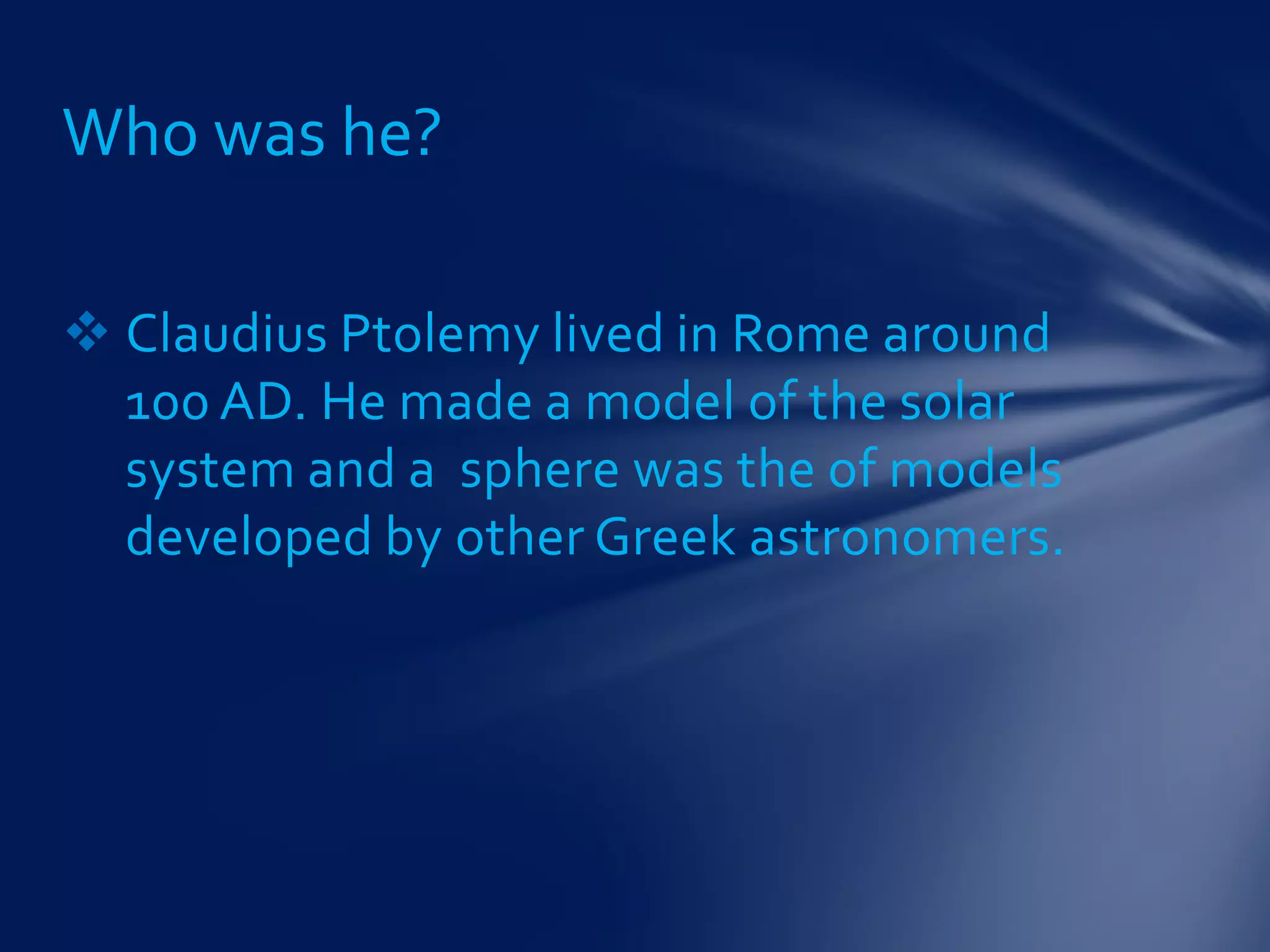 Claudius Ptolemy was an astronomer who lived in Rome around 100 AD. He developed a geocentric model of the solar system that placed Earth at the center, which built upon models from Greek astronomers before him but could more accurately explain planetary motions. Ptolemy presented his model, which became the accepted astronomical model for centuries, through written tables that could compute past and future positions of planets.