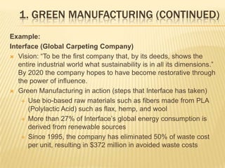 Green manufacturing aims to make products and processes safer for the environment and human health. It focuses on using less toxic materials, post-consumer recycled content, locally sourced materials, and renewable energy. Interface, a carpet manufacturer, has transitioned to using bio-based raw materials, sources over 27% of its energy from renewables, and has eliminated 50% of waste costs. Deconstruction is the careful dismantling of structures to maximize reuse of materials and minimize landfill waste. Reuse keeps goods out of the waste stream by redistributing still-usable items, while recycling collects, sorts, and reprocesses used materials into new raw materials. Remanufacturing disassembles worn equipment to reuse sound parts and build new products