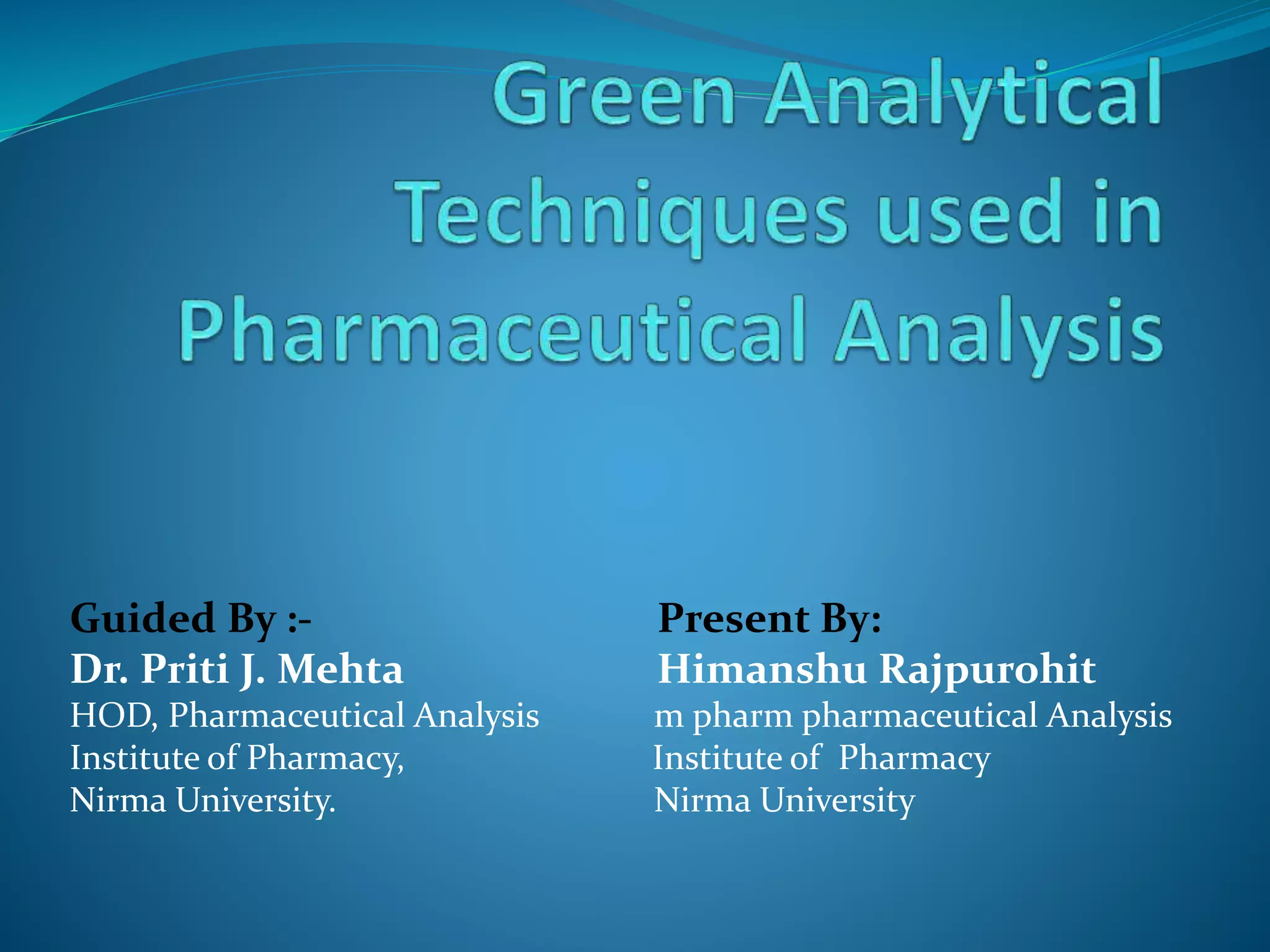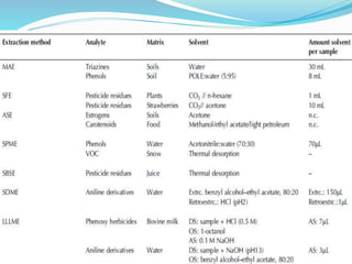 This document discusses green analytical chemistry and ways to make analytical methods more environmentally friendly. It describes principles of green chemistry and how they can be applied to analytical techniques. Some ways to make methods greener include reducing solvent and reagent use through miniaturization, automation, direct analysis of samples, and online recycling or decontamination of waste. Specific greener sample pretreatment and analytical techniques are also outlined, such as microwave-assisted extraction, solid-phase microextraction, and Fourier transform infrared spectroscopy for solvent-free determinations. The overall goal is to minimize environmental impacts and hazards of chemical analysis.