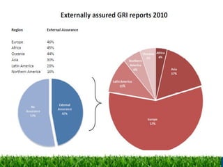 The document discusses green auditing, including planning, areas of concern, reporting, and implementation. It provides an overview of the necessity of green audits and differences between internal/external audits. Key aspects of audit planning discussed are engagement circumstances, risks, intended users, and standards like AA1000. Areas of concern addressed include regulations, waste management, and supply chain risks. Reporting guidelines from India, GRI, and benefits of reporting are covered. Implementation is shown to involve deciding to report, identifying impacts and audiences, and assuring and publishing the final report.