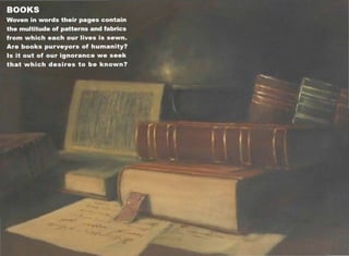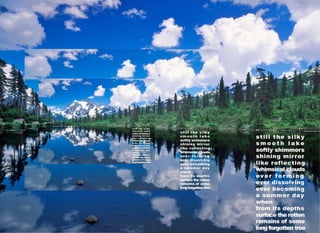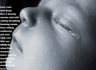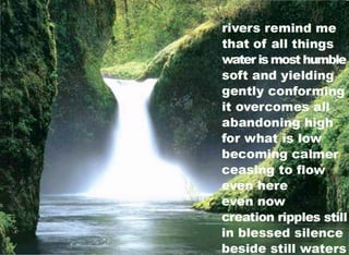 The document touches on themes of nature, mindfulness, compassion, love and spirituality. It includes quotes and passages from figures like the Dalai Lama, Rumi, Einstein and others. The selections provide insights into topics like prayer, art, kindness and finding simplicity from various religious and philosophical perspectives.