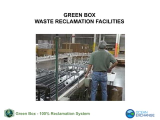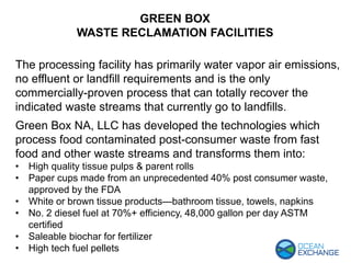 The Green Box waste reclamation facilities can fully recover various waste streams currently sent to landfills through a process that has primarily water vapor air emissions and no effluent or landfill requirements. The process transforms food contaminated post-consumer waste into products like tissue paper, paper cups containing up to 40% post-consumer waste approved by the FDA, diesel fuel, biochar fertilizer, and fuel pellets. It achieves 100% organic solid waste reclamation and sustainability with zero waste to landfills or waste water discharge.