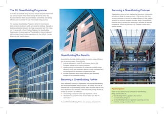 The document outlines the EU GreenBuilding Programme, which aims to enhance energy efficiency and promote renewable energy sources in non-residential buildings. It highlights the significant energy savings potential in the building sector, emphasizing optimization of building envelopes and systems as key areas for improvement. Organizations can participate as either GreenBuilding partners or endorsers by achieving a minimum reduction of 25% in total primary energy demand.