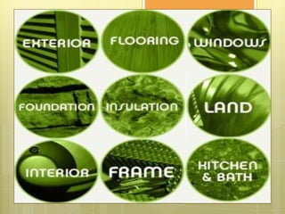Green building aims to reduce environmental impact through sustainable and efficient practices across a building's entire lifecycle. It focuses on siting, design, construction, operation, and deconstruction to optimize energy efficiency, water efficiency, materials efficiency, and waste reduction/management. Specifically, it emphasizes the use of high-performance windows and insulation, effective window placement, onsite renewable energy, low-flow fixtures, rapidly renewable and recyclable materials, and converting waste into resources like fertilizer.