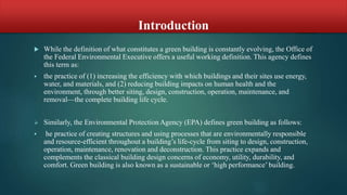 The document discusses green building principles and materials. It defines green building as construction practices that are environmentally responsible and efficient over a building's entire lifecycle. Green buildings aim to reduce energy and water usage, minimize waste, and promote health. Key principles include sustainable site design, water conservation, energy efficiency, indoor environmental quality, and use of green materials like recycled steel and dimension stone. The case study highlights the CII Godrej Green Building Center in India, which uses strategies like solar power, natural ventilation, water recycling, and earth sheltering to achieve high resource efficiency.