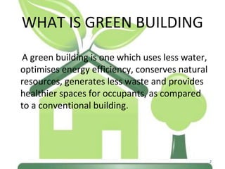 The document discusses green building, which aims to reduce environmental impact through techniques like energy efficiency, water conservation, and generating less waste. It provides examples of green building projects in India, noting their sustainability features like solar power, rainwater harvesting, and use of recycled materials. Certification programs like LEED rate buildings on their environmental performance, with platinum being the highest rating.
