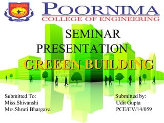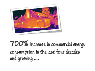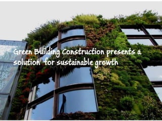 The document discusses the concept of green buildings, which aim to use less water, energy, and resources while generating less waste and providing healthier living spaces. It highlights the significant environmental impact of conventional buildings in India, including high energy consumption and waste generation during construction. Additionally, it outlines the benefits and obstacles of green building practices, as well as the GRIHA rating system for assessing environmental performance.