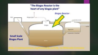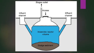 Solar energy, wind energy, and biogas are important renewable energy sources with various applications. Solar energy can be harnessed using technologies like solar panels, photovoltaic cells, and concentrated solar power to generate electricity or heat water. Wind turbines convert kinetic wind energy to mechanical or electrical power. Biogas is produced through anaerobic digestion of organic waste and can be used as fuel for cooking or generating electricity. Proper management of greywater, blackwater, and solid waste is crucial to prevent environmental pollution and disease.