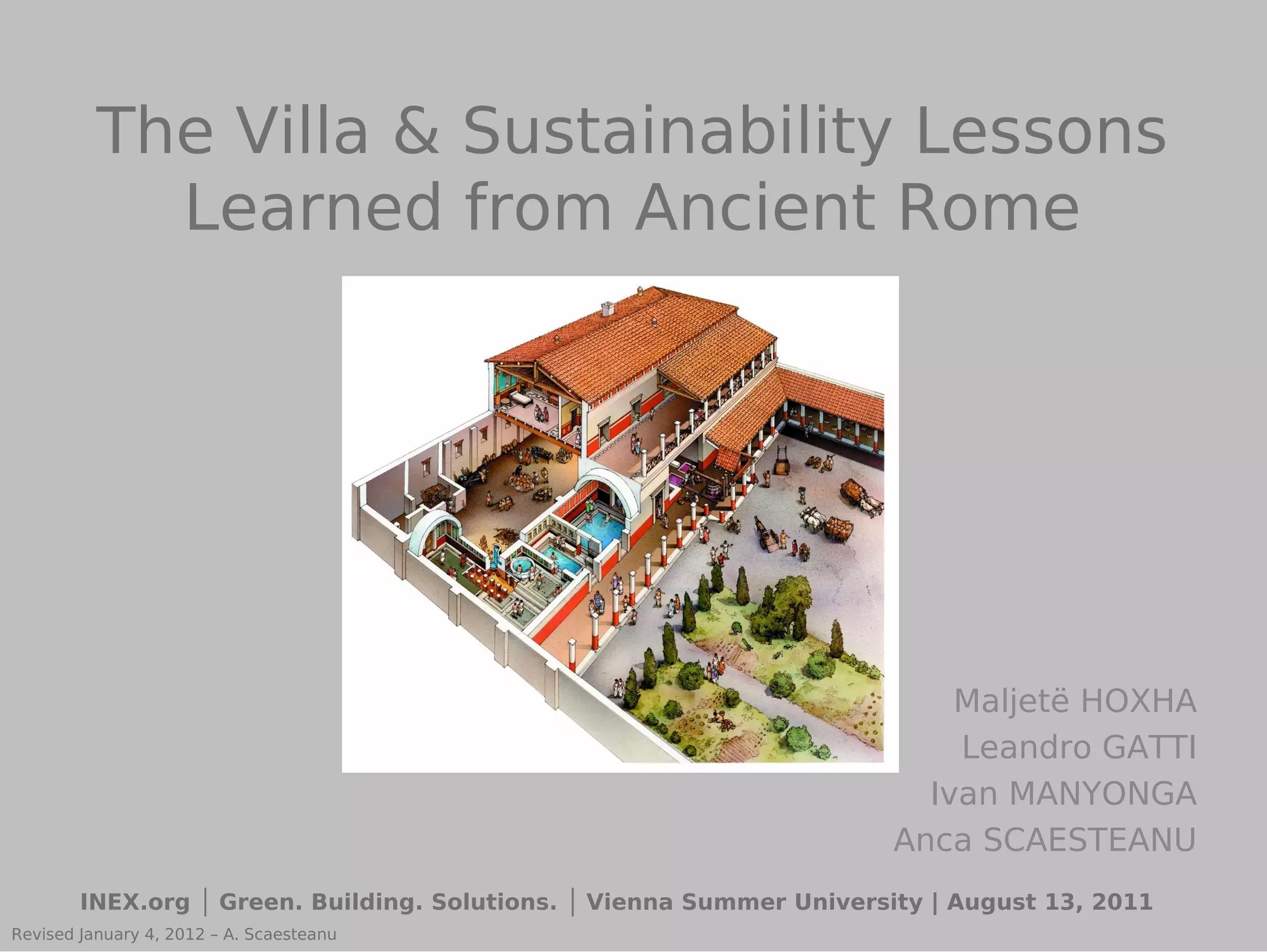 The document discusses sustainability lessons that can be learned from ancient Roman architecture and infrastructure. The Romans oriented buildings strategically depending on climate and use, laid out cities in a grid pattern, and developed advanced systems for transporting water and removing waste. They also utilized renewable energy sources like water mills. Overall, the Romans demonstrated sophisticated approaches to construction, urban planning, and resource management that remain relevant today.