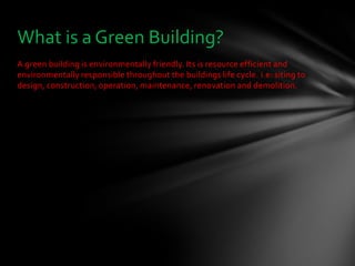 A green building is environmentally friendly and resource efficient throughout its lifecycle. It reduces waste, pollution, and energy and water usage while protecting occupant health. Un-green buildings lack features like natural light, motion-sensing lights, and resource efficiency. They waste energy through unnecessary lighting or air conditioning. Green buildings use natural materials, efficient lighting, and maximize natural light to conserve resources. The school analyzed has more un-green than green features but is working to improve its sustainability.