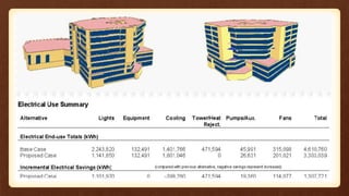 The document provides information on several green buildings that have achieved certification under rating systems like GRIHA and LEED. It discusses the passive and active design strategies implemented in buildings like the Indira Paryavaran Bhawan in Delhi, Centre for Environmental Sciences & Engineering at IIT Kanpur, Anna Centenary Library in Chennai and ITC Green Centre in Gurgaon that have enabled them to minimize energy and water consumption and obtain high ratings. These strategies include optimal orientation, daylighting, natural ventilation, renewable energy systems, water harvesting and efficient HVAC and lighting designs.