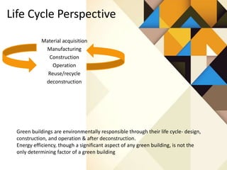 Green buildings are designed to be environmentally responsible throughout their entire life cycle. While energy efficiency is important, it is not the only factor that determines if a building is green. GRIHA evaluates buildings from a whole life perspective, considering energy use, materials, waste, and water management. It provides definitive standards for green buildings and rates their overall performance, not just energy efficiency. Regular monitoring during construction and operation is needed to ensure buildings meet their intended green performance.