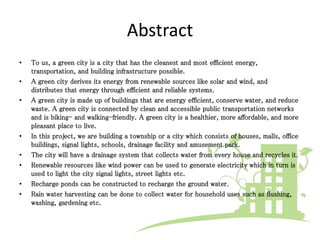 This document outlines plans for developing a green city that focuses on sustainability. Some key points: