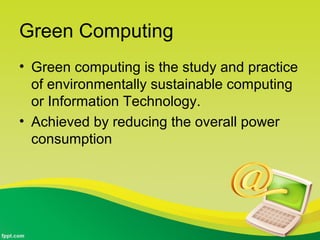This document discusses green cloud computing. It begins by defining green computing and cloud computing individually. Green computing aims to reduce power consumption and environmental impact of IT, while cloud computing involves virtualized and interconnected computers. Green cloud computing combines these concepts by making cloud infrastructure and operations more energy efficient. The document then covers benefits like reduced energy use, the role of dynamic provisioning and multi-tenancy in cloud enabling green computing, and a case study on a green cloud architecture and scheduling policies that can reduce carbon emissions by 20%.