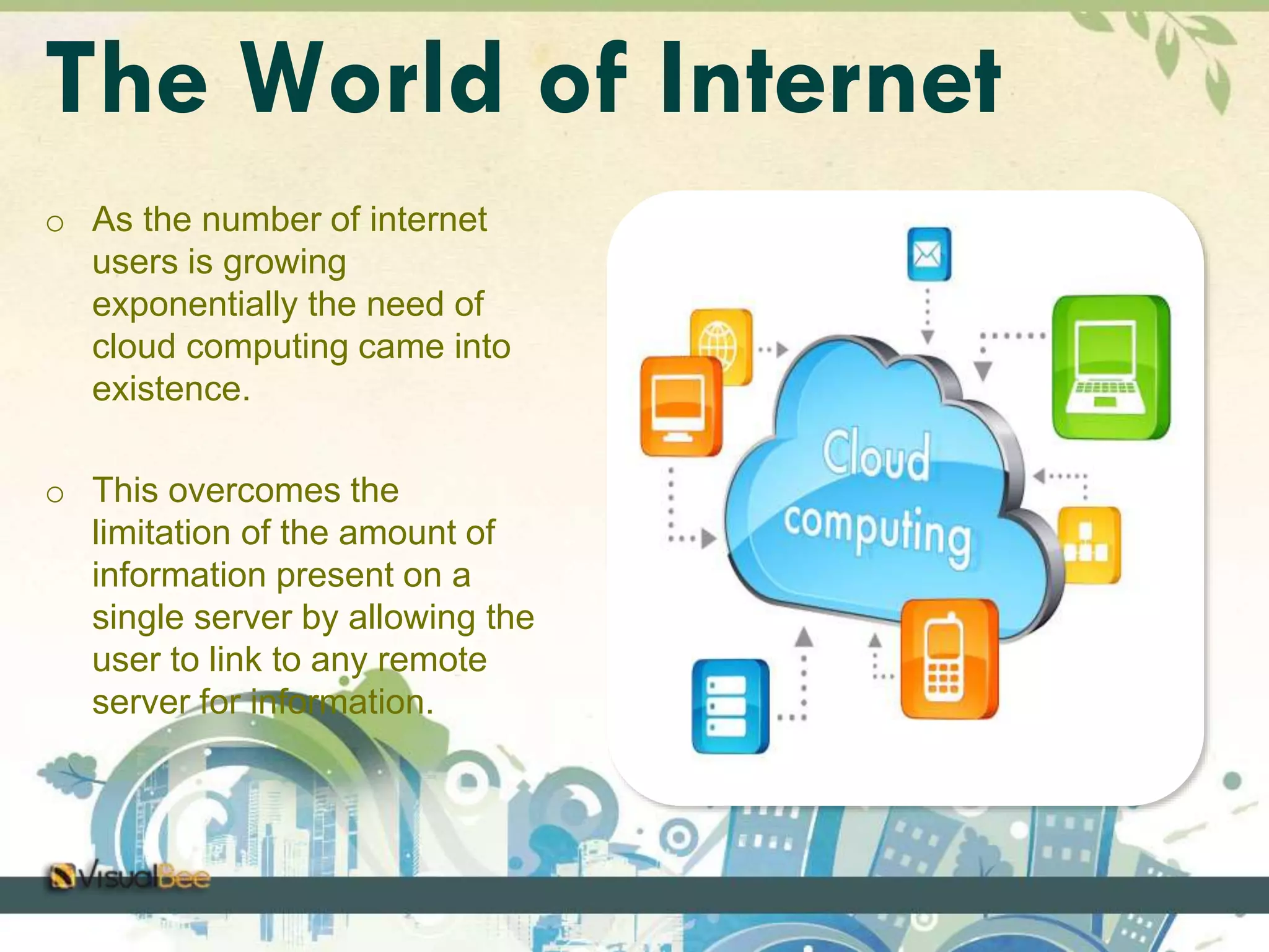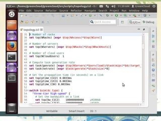 The document discusses the concept of green cloud computing aimed at enhancing environmental sustainability through energy efficiency in cloud services. It highlights the need for innovative solutions to reduce the carbon footprint of data centers, which consume significant power and resources. Additionally, it introduces the green cloud simulator as a tool for modeling energy consumption in data centers, while also identifying challenges and future aspirations for better energy management.