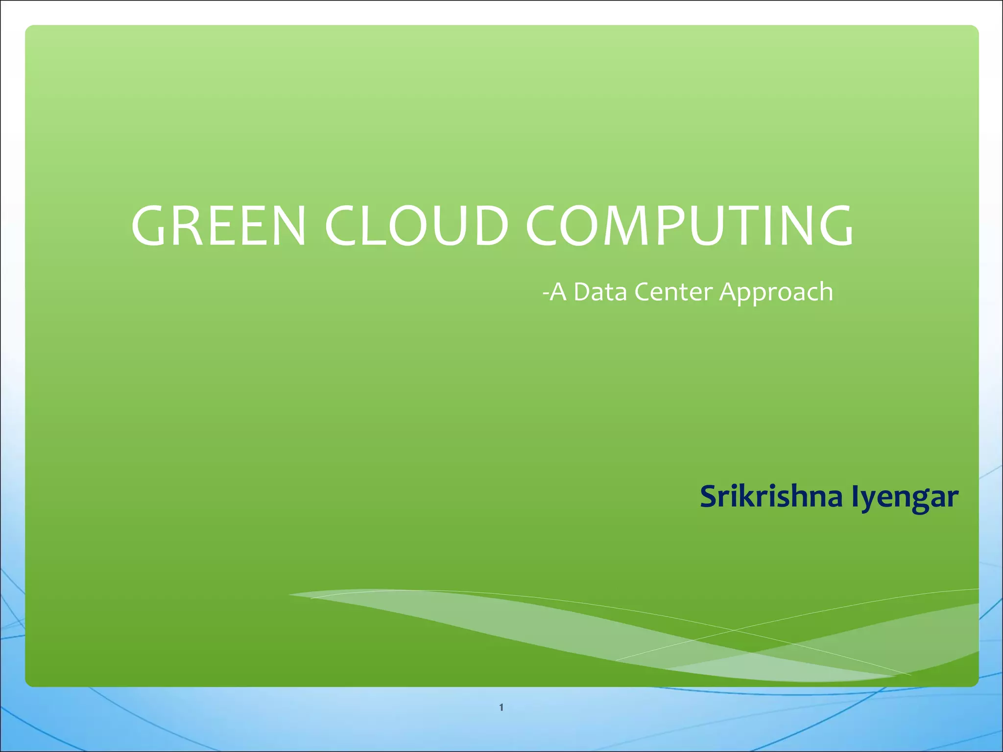 This document discusses green cloud computing and data centers. It provides an overview of green computing principles like efficiency and virtualization. Cloud computing is described as a virtualized and scalable computing platform. Green cloud computing from a data center perspective involves diagnosing issues, measuring energy usage, server virtualization, and building efficiently. Case studies from Senegal, South Africa, and India show how green data center approaches and private clouds can reduce energy costs and increase efficiency. The document advocates for more research on maximizing green data center efficiency to benefit developing regions.