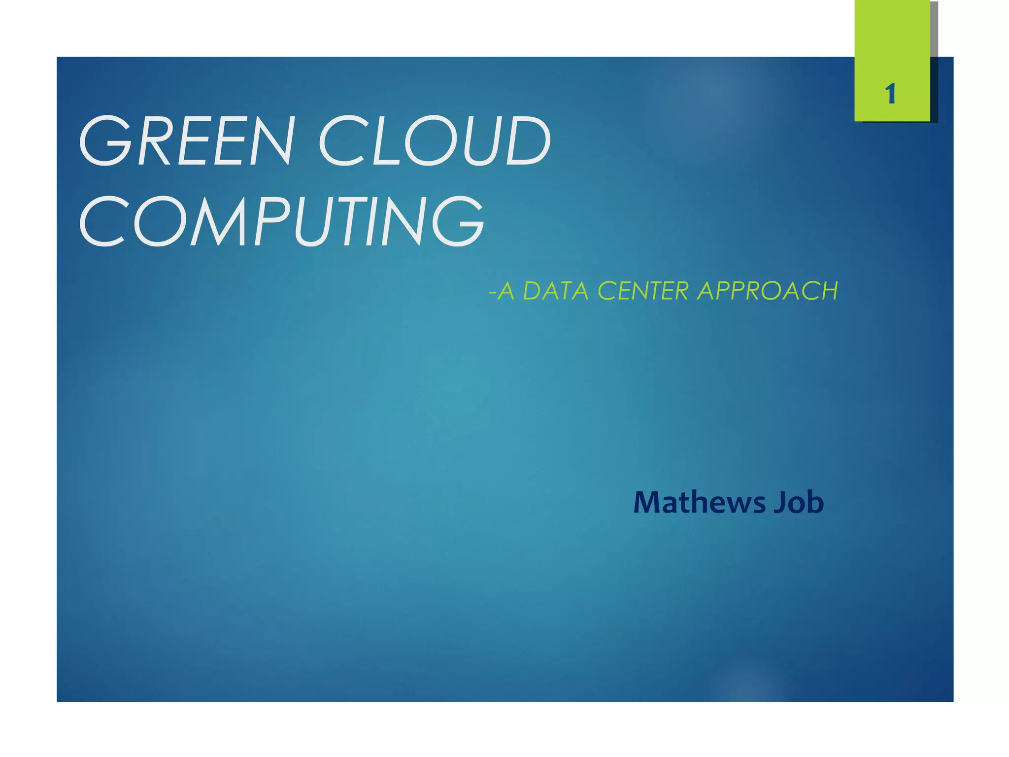 This document discusses green cloud computing and data centers from an energy efficiency perspective. It begins with basics of green computing and cloud computing concepts. It then discusses green cloud computing in the context of data centers, describing steps to make data centers more energy efficient through server virtualization, energy-aware workload consolidation, and using more efficient cooling methods. Case studies from Senegal, South Africa, and India are presented showing how green cloud computing approaches have helped reduce energy use and costs for organizations in developing areas. Key metrics like PUE (power usage effectiveness) for measuring data center efficiency are also covered.