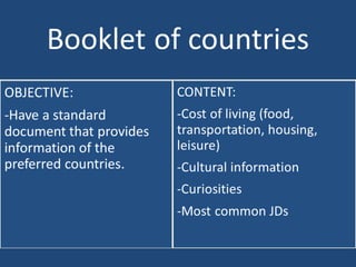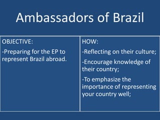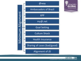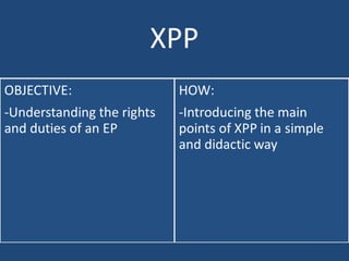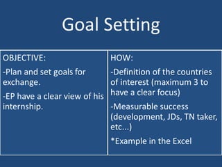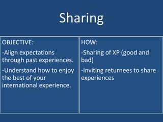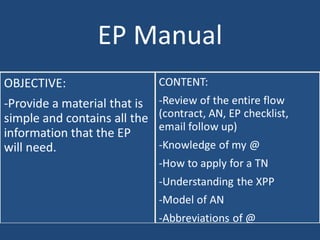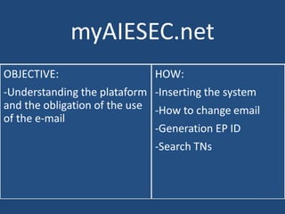 The Micro Experiences program aims to promote interaction between exchange participants (EPs) and strengthen their connection to the AIESEC entity. It includes activities before, during, and after the exchange. Before departing, EPs meet to discuss internship goals, information collection for the host country, and strengths/weaknesses. During the exchange, EPs are encouraged to participate in short-term AIESEC roles like being a host, buddy, or organizing committee member. After the exchange, EPs can become EP managers to help other EPs. The program aims to generate leadership positions and increase EPs' reintegration into AIESEC. Standard processes around operations, auditing, and email use are outlined to support effective