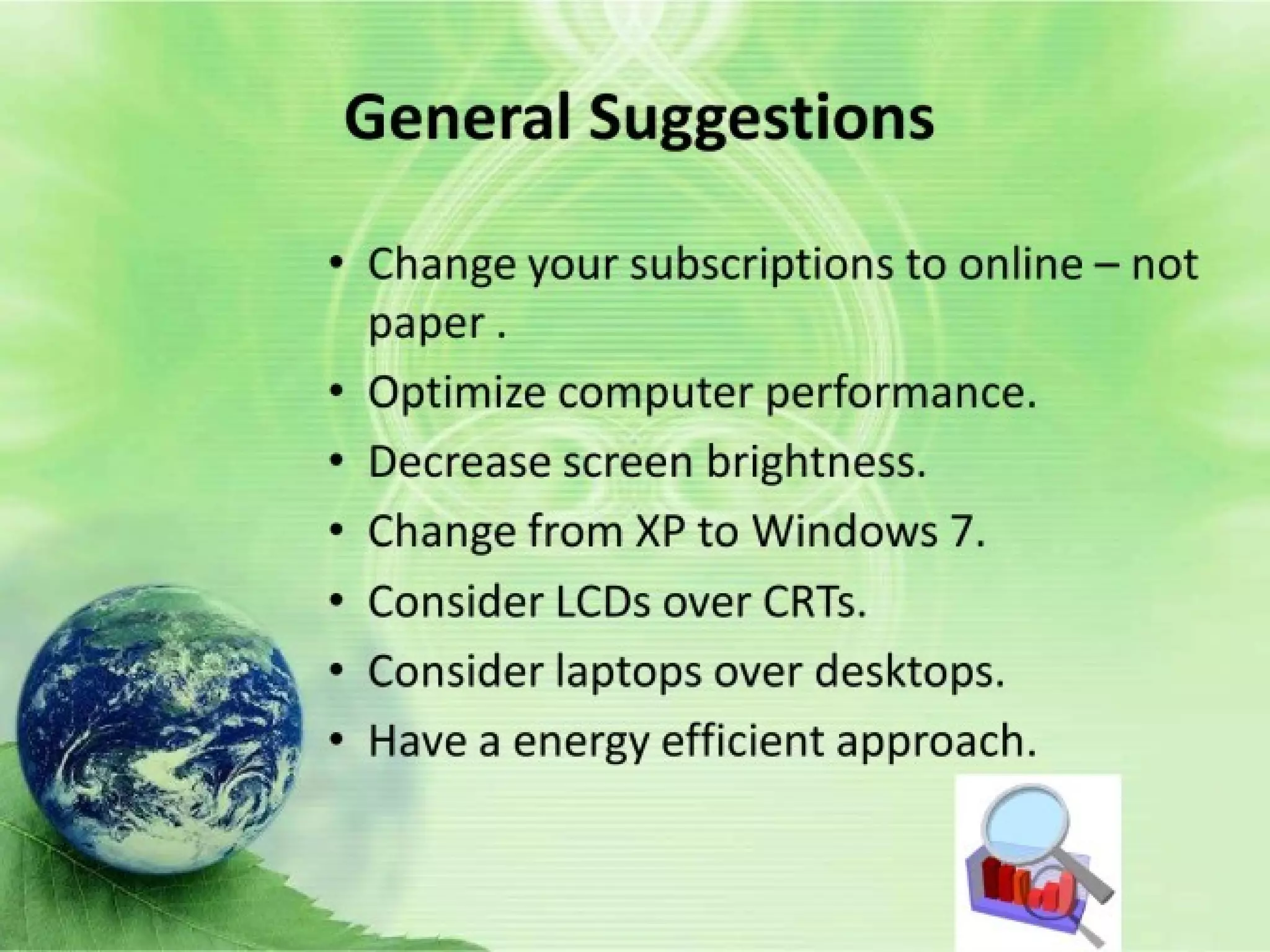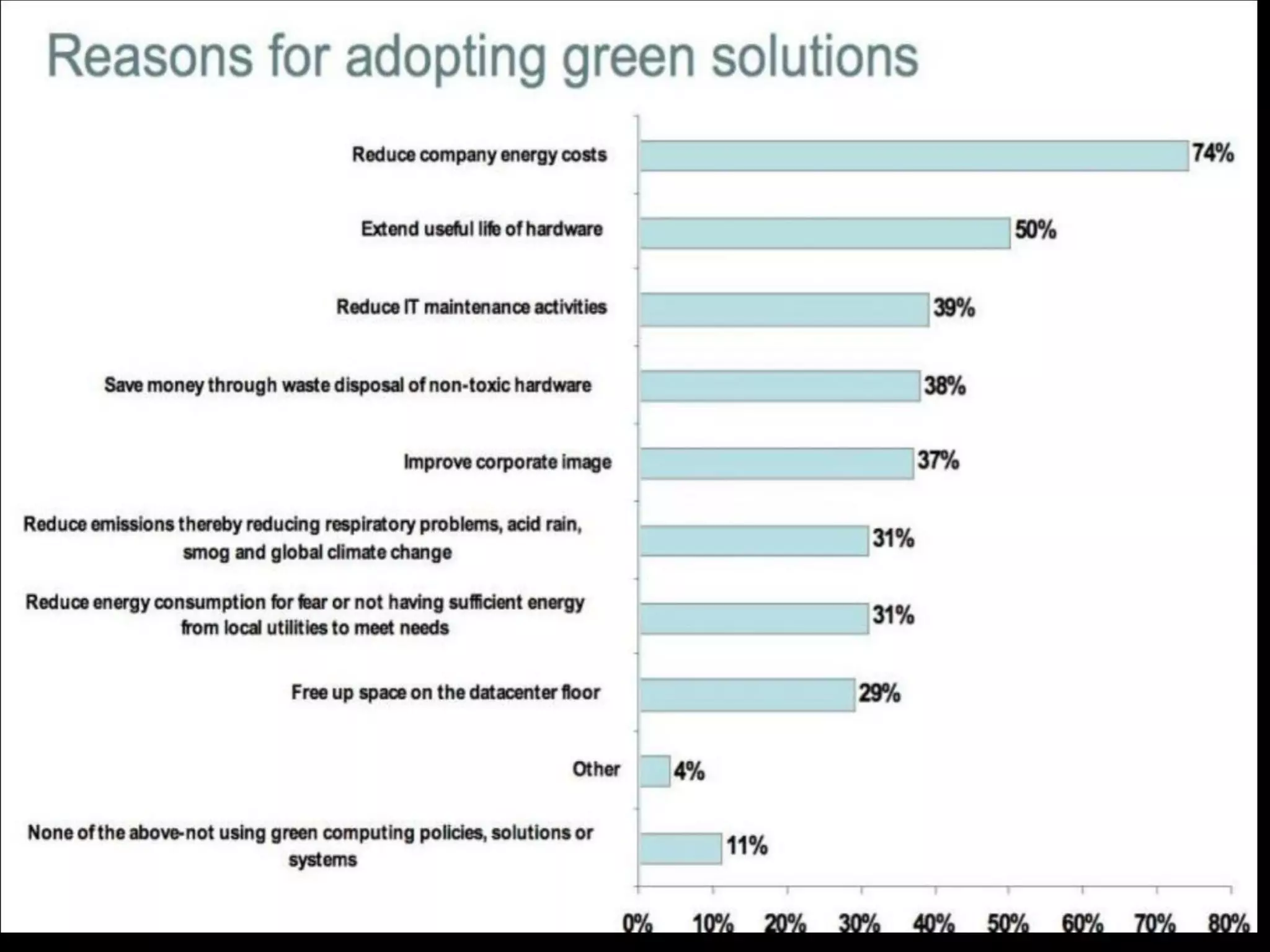 Describes methods of implementing green computing such as virtualization, recycling, and energy-efficient technologies like solar computing.
