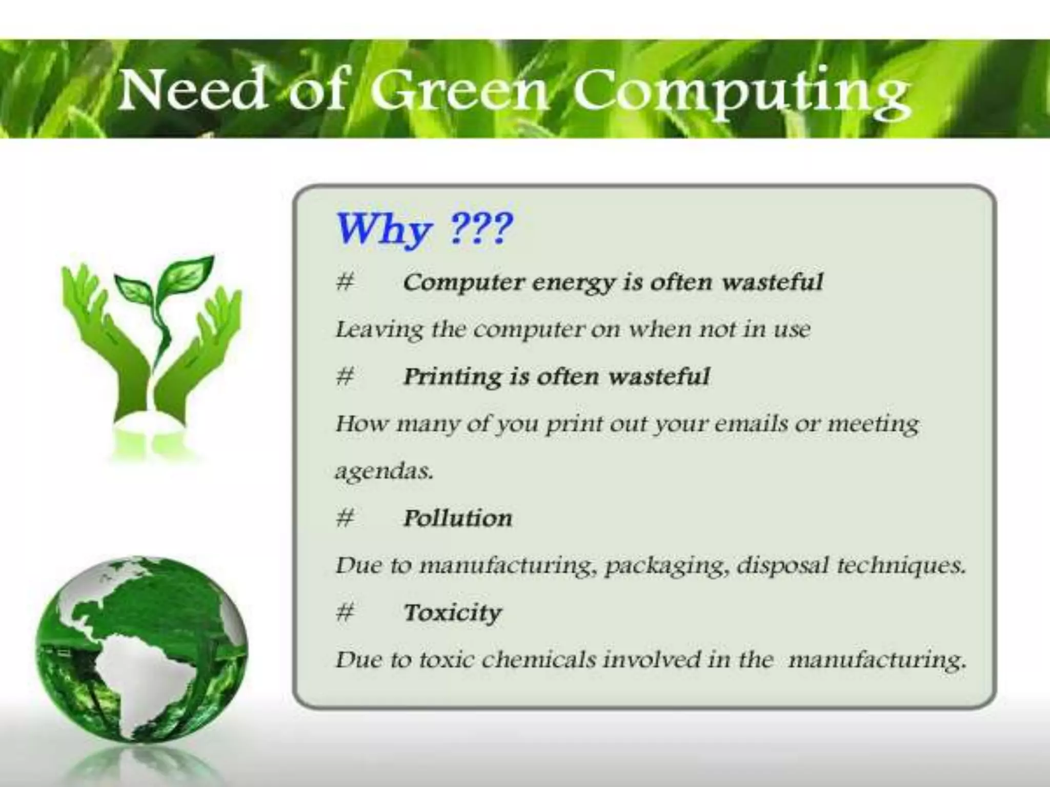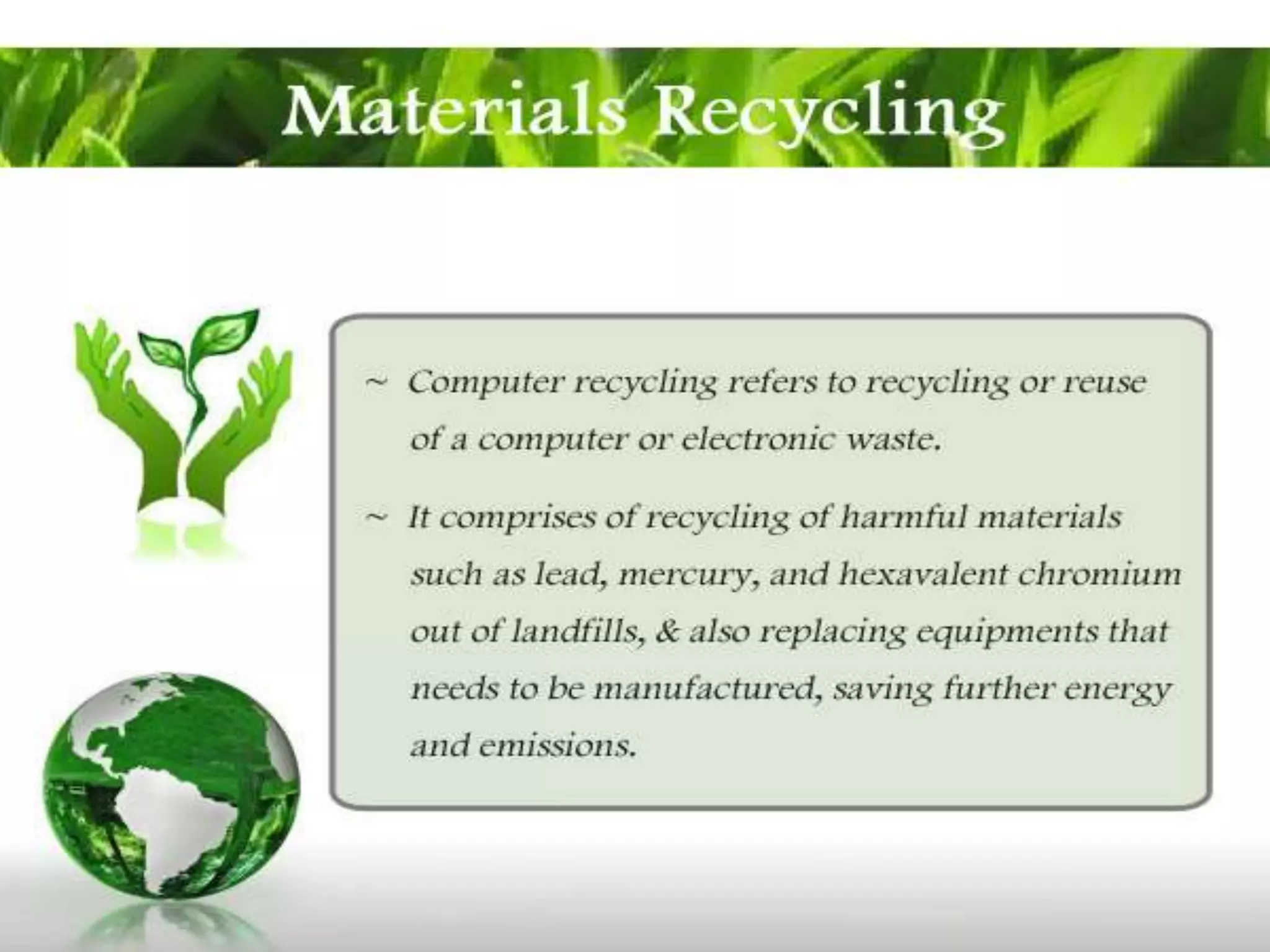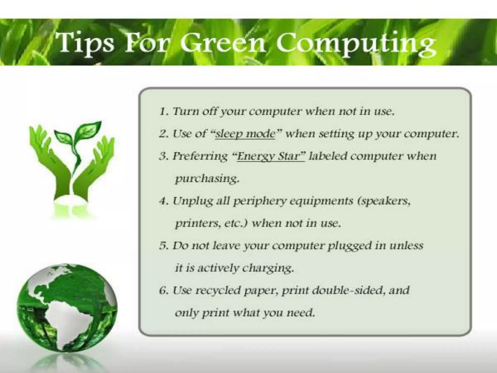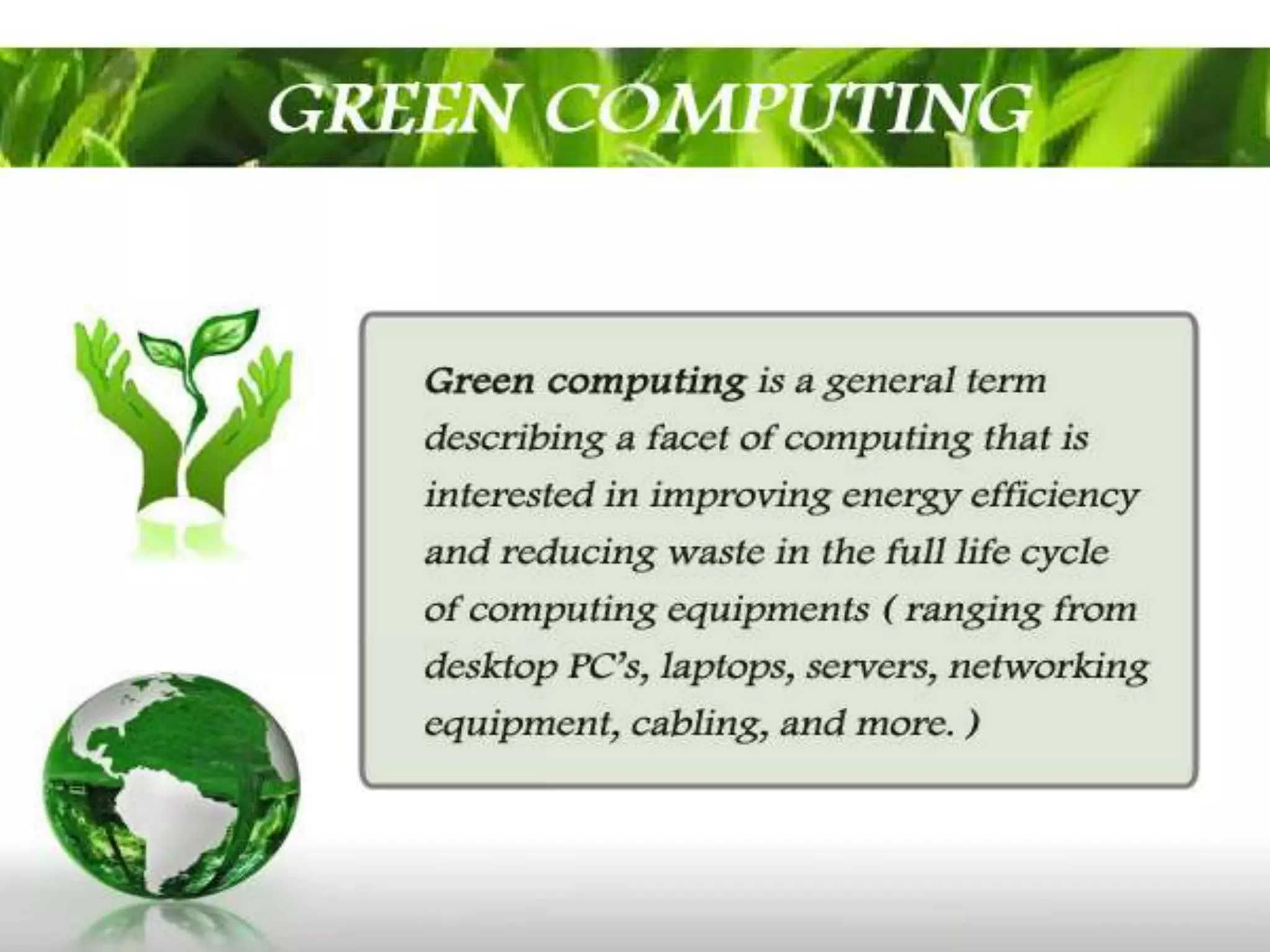 Energy Star was a early program launched in 1992 that awarded an voluntary label to computing products that minimized energy usage while maximizing efficiency, applying to items like computer monitors, TVs, refrigerators, and air conditioners. A typical PC uses around 120 Watts for the CPU and 150 Watts for the CRT monitor during 8 hours of daily usage, accounting for significant energy consumption. The document discusses various green technologies, strategies for reducing energy usage while online like using the blackle.com search engine, and proper disposal and recycling of electronic components.