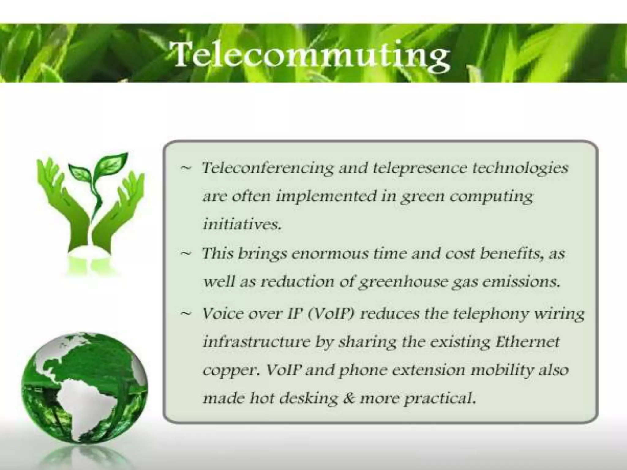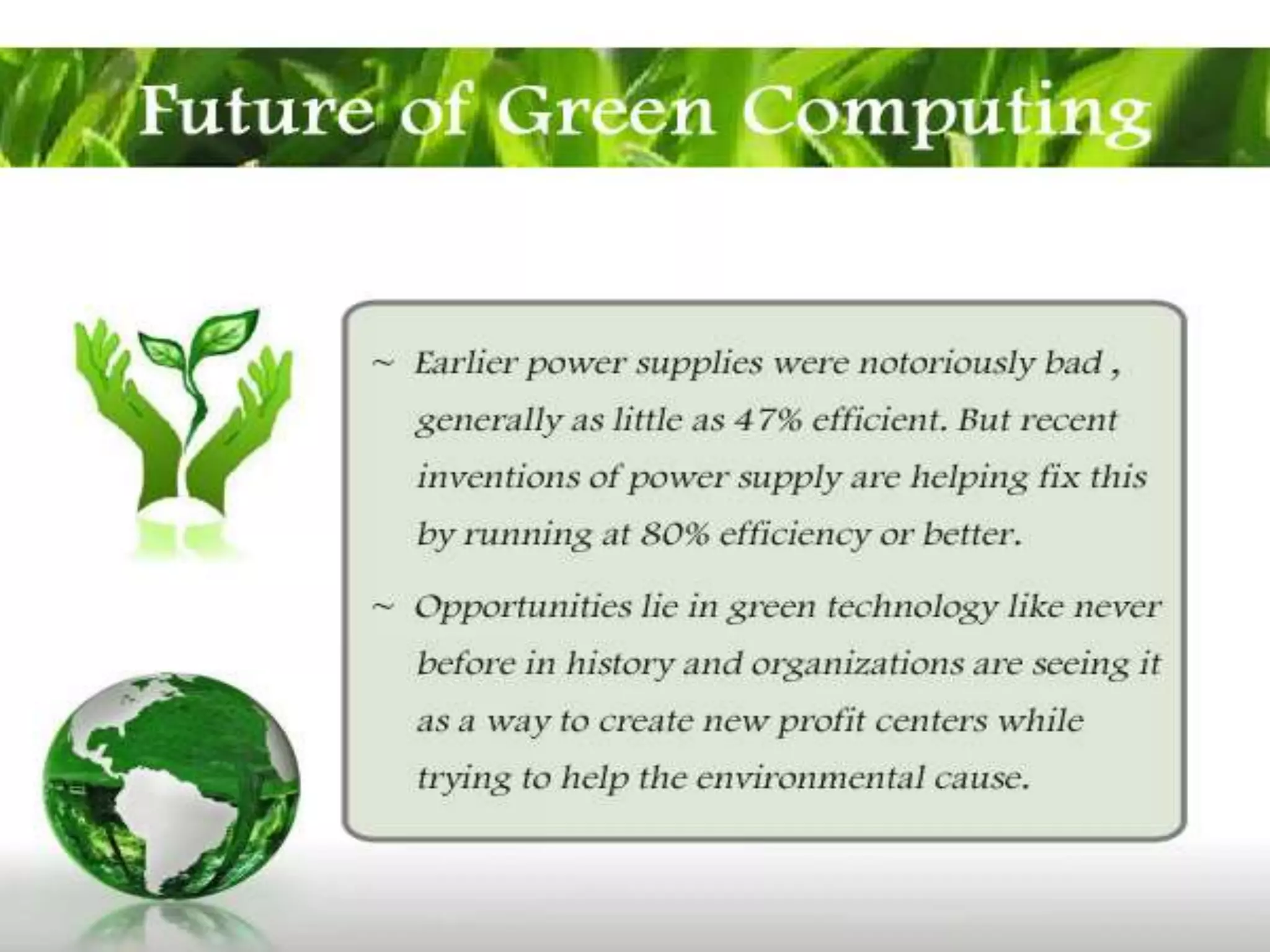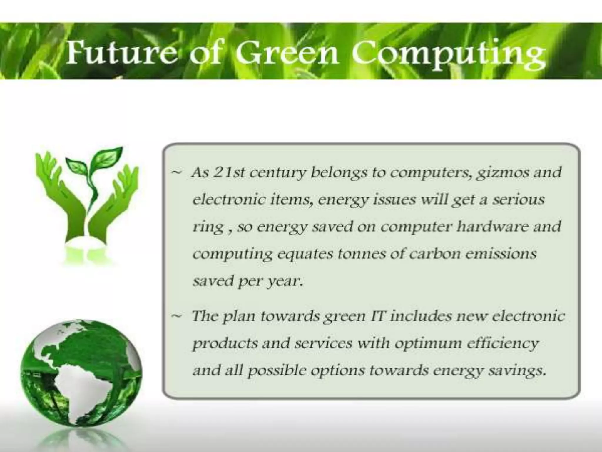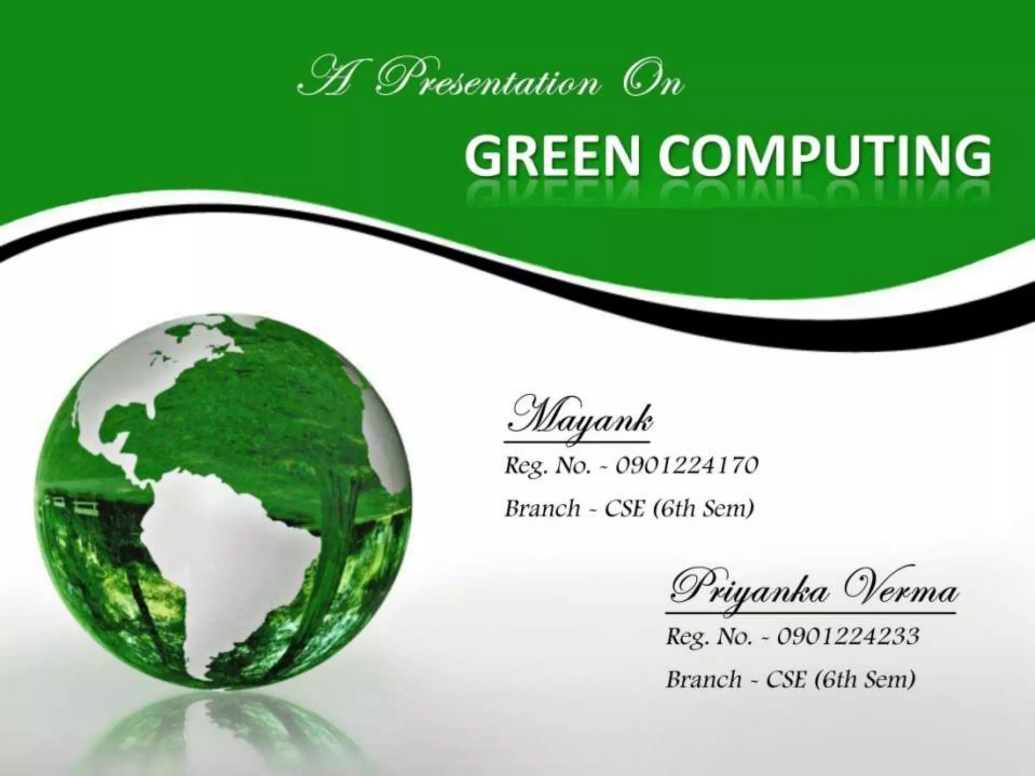 Energy Star was a early program launched in 1992 that awarded an voluntary label to computing products that minimized energy usage while maximizing efficiency, applying to items like computer monitors, TVs, refrigerators, and air conditioners. A typical PC uses around 120 Watts for the CPU and 150 Watts for the CRT monitor during 8 hours of daily usage, accounting for significant energy consumption. The document discusses various green technologies, strategies for reducing energy usage while online like using the blackle.com search engine, and proper disposal and recycling of electronic components.