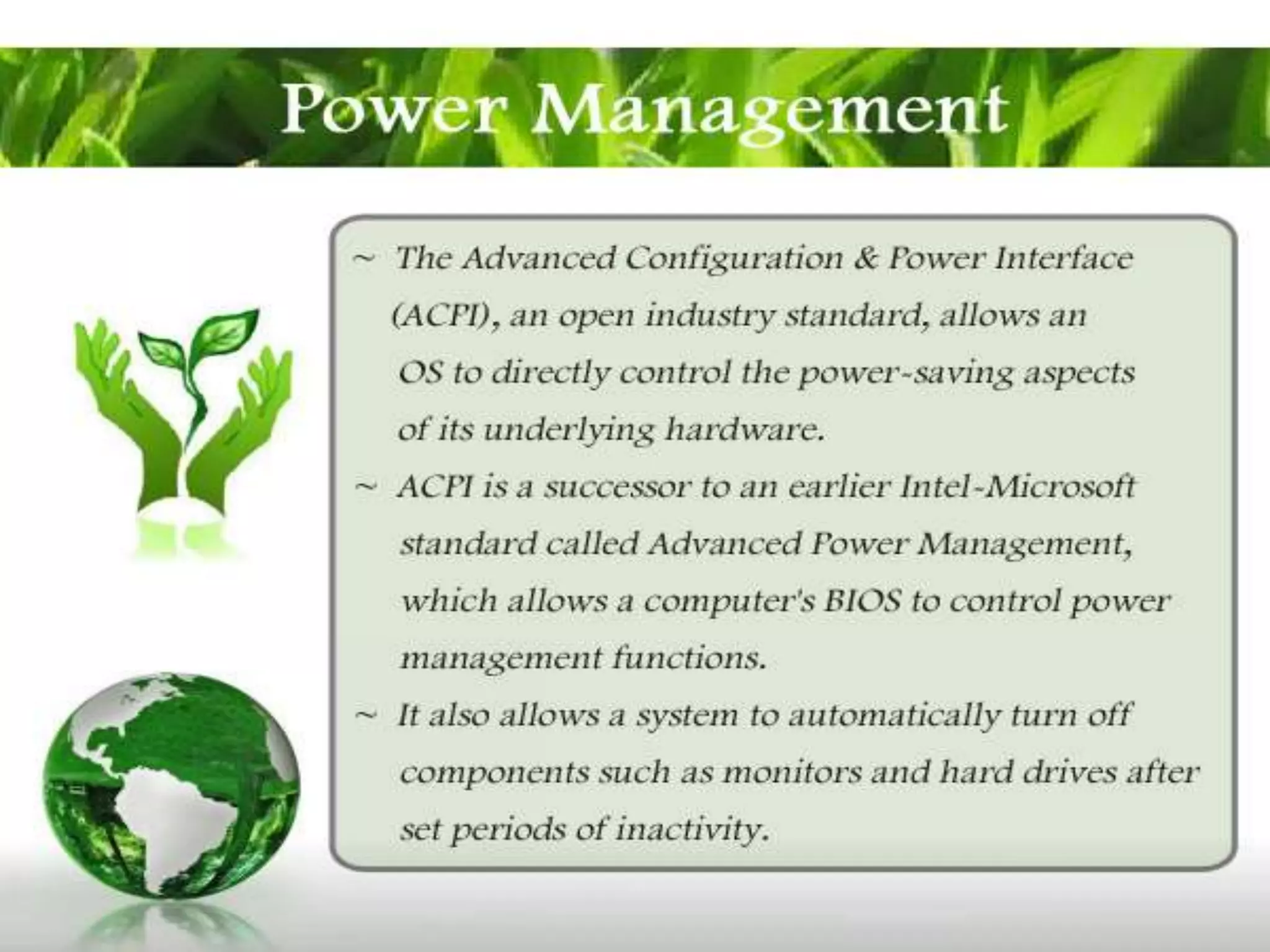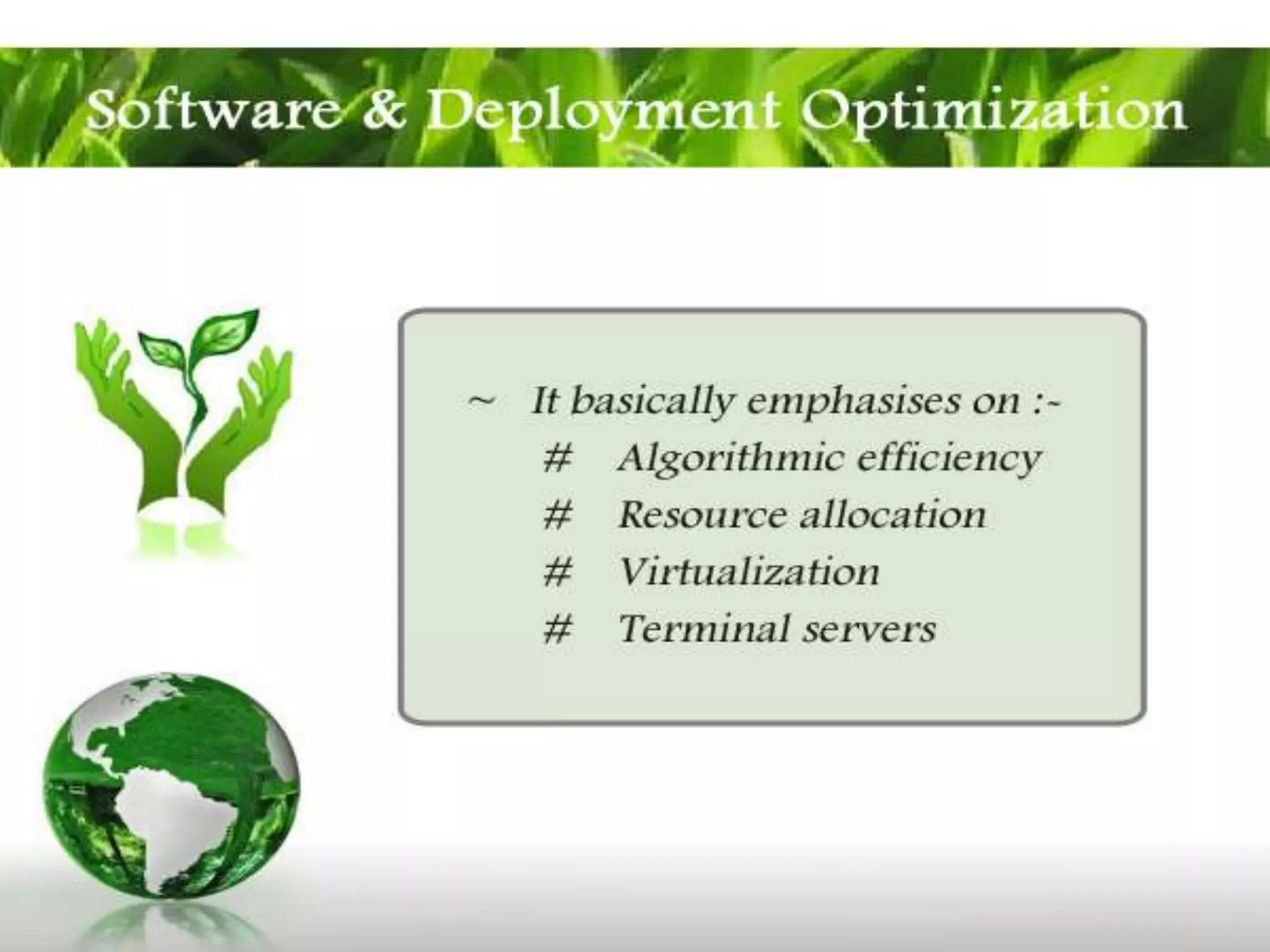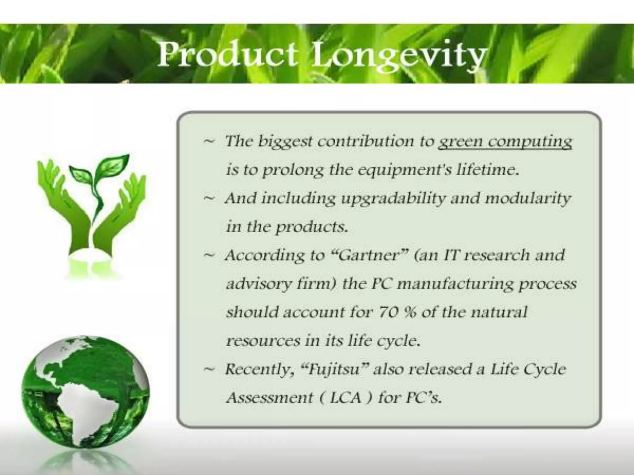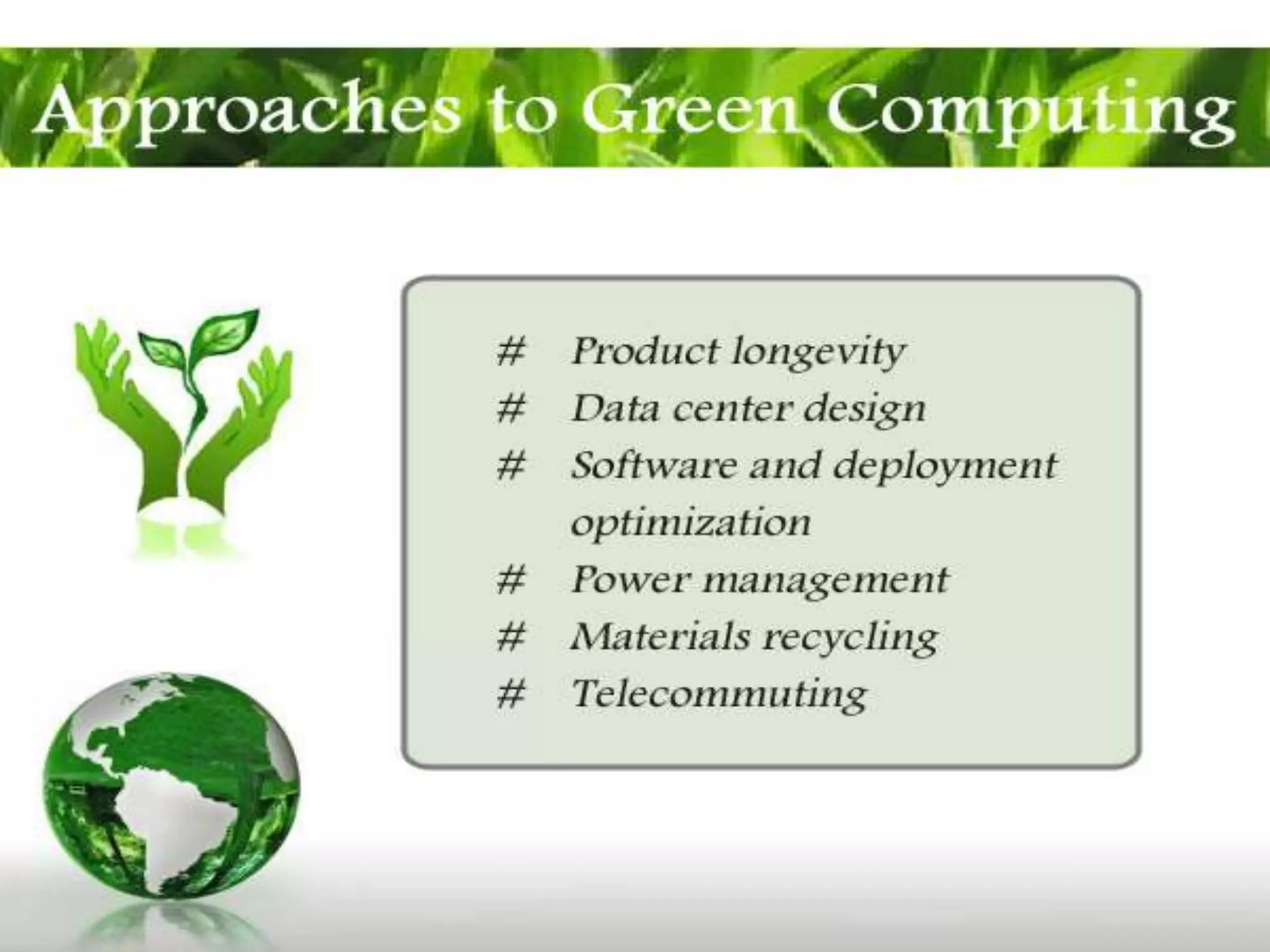 Energy Star was a early program launched in 1992 that awarded an voluntary label to computing products that minimized energy usage while maximizing efficiency, applying to items like computer monitors, TVs, refrigerators, and air conditioners. A typical PC uses around 120 Watts for the CPU and 150 Watts for the CRT monitor during 8 hours of daily usage, accounting for significant energy consumption. The document discusses various green technologies, strategies for reducing energy usage while online like using the blackle.com search engine, and proper disposal and recycling of electronic components.