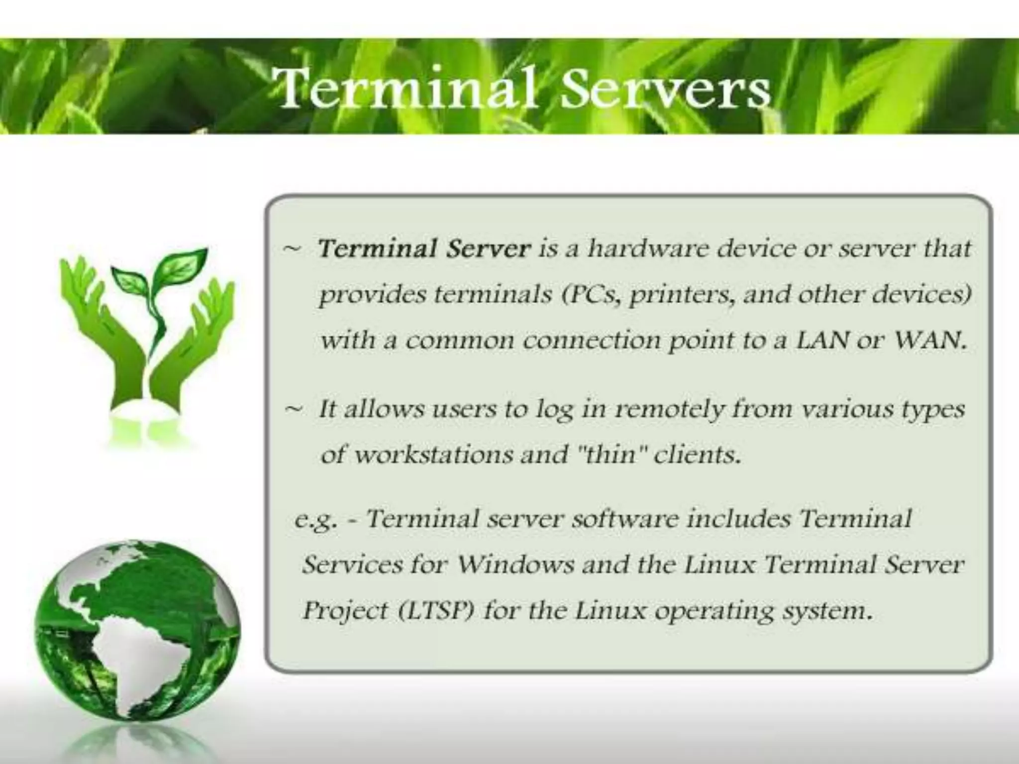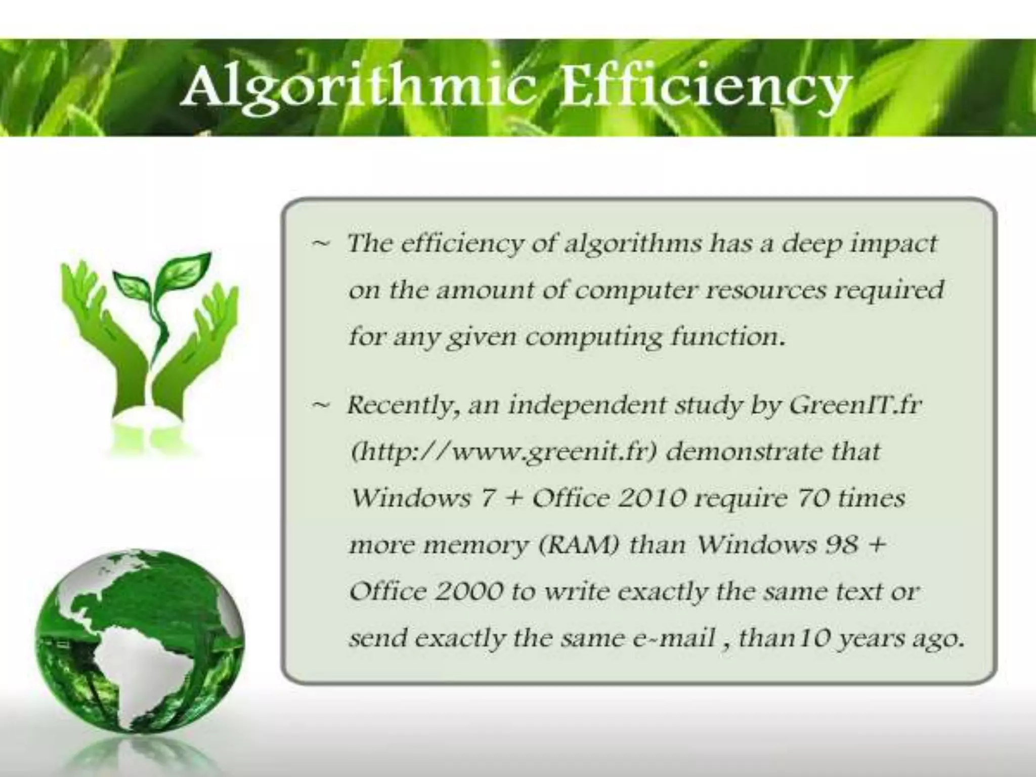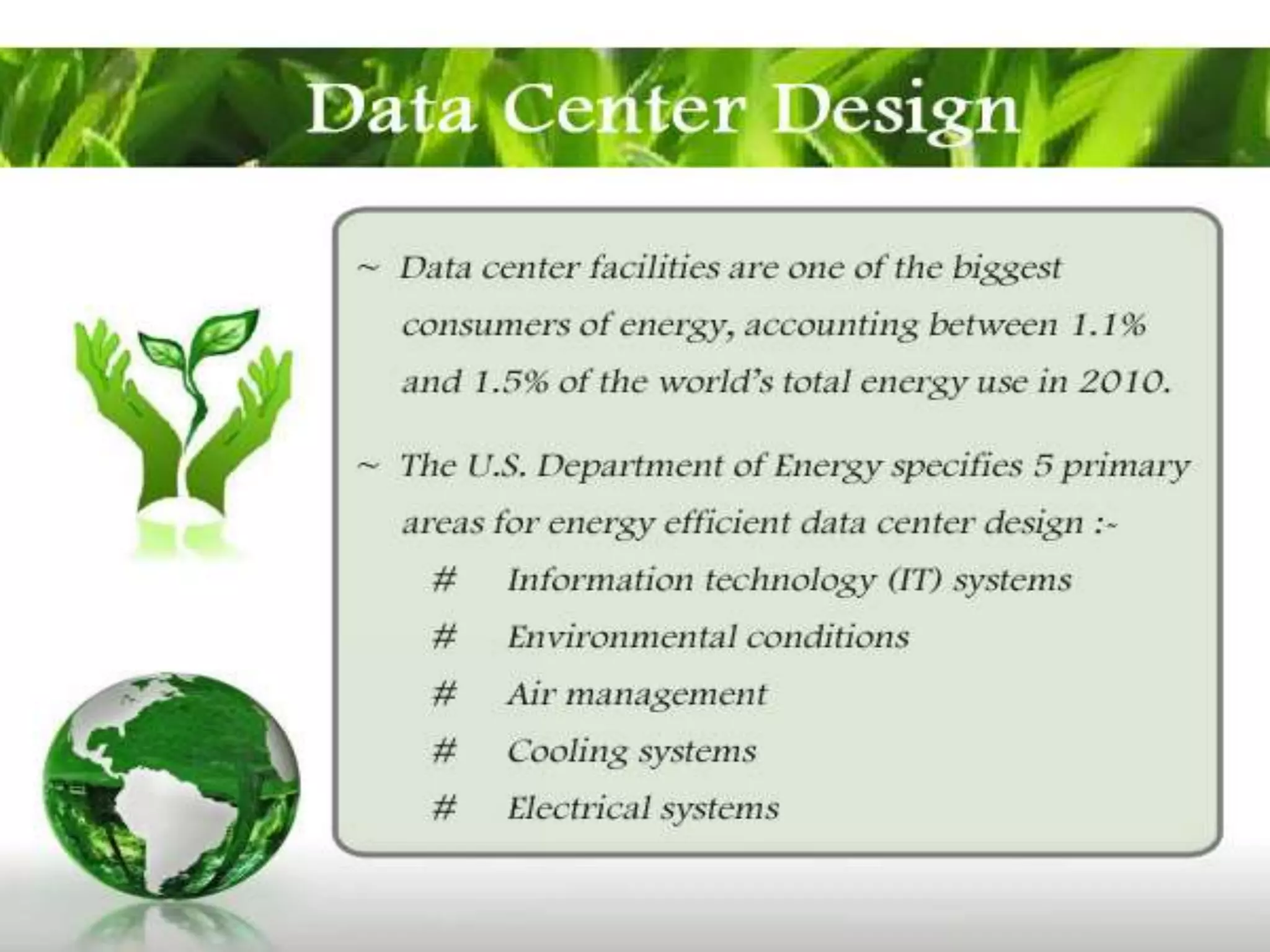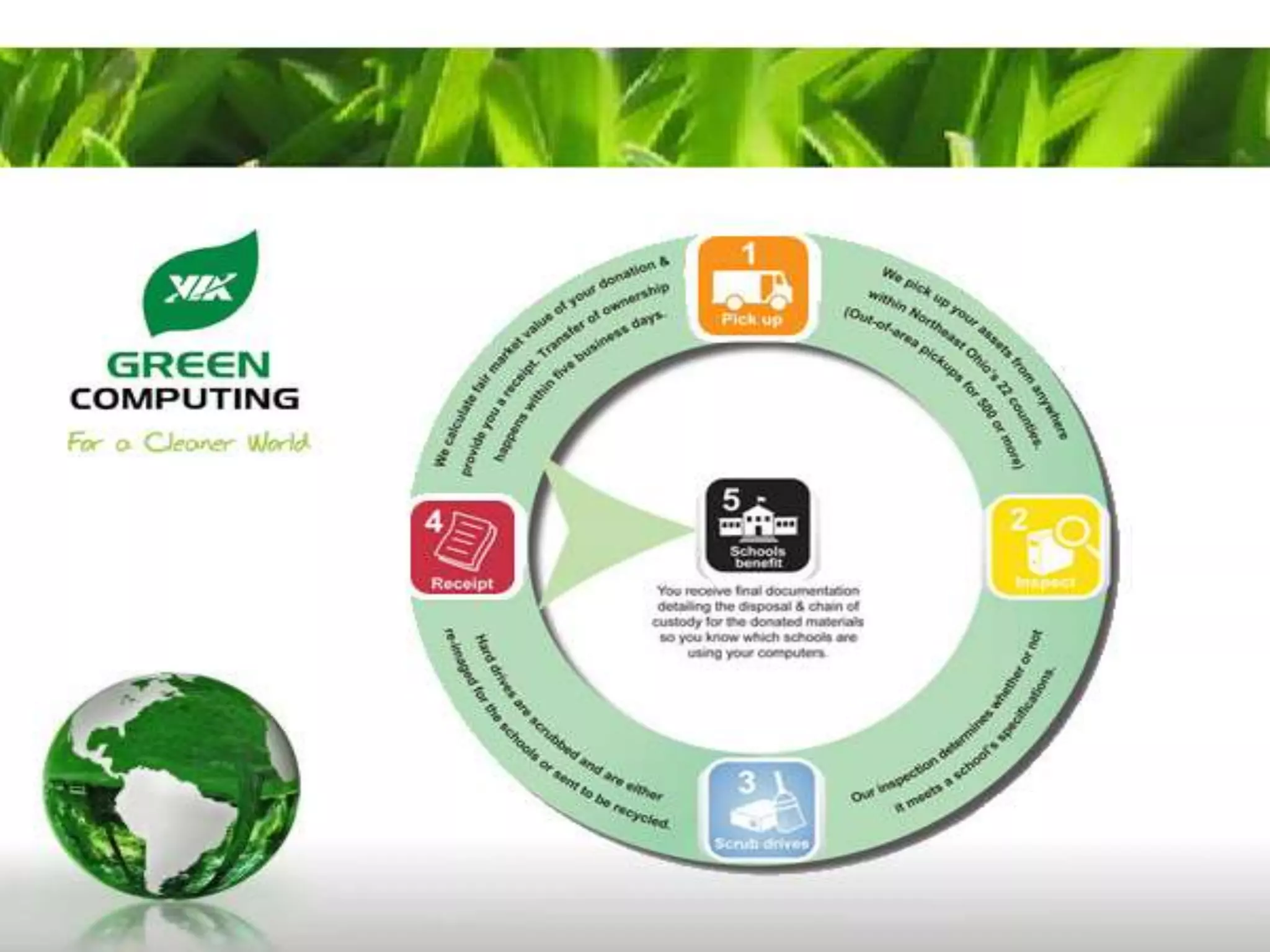 Energy Star was a early program launched in 1992 that awarded an voluntary label to computing products that minimized energy usage while maximizing efficiency, applying to items like computer monitors, TVs, refrigerators, and air conditioners. A typical PC uses around 120 Watts for the CPU and 150 Watts for the CRT monitor during 8 hours of daily usage, accounting for significant energy consumption. The document discusses various green technologies, strategies for reducing energy usage while online like using the blackle.com search engine, and proper disposal and recycling of electronic components.