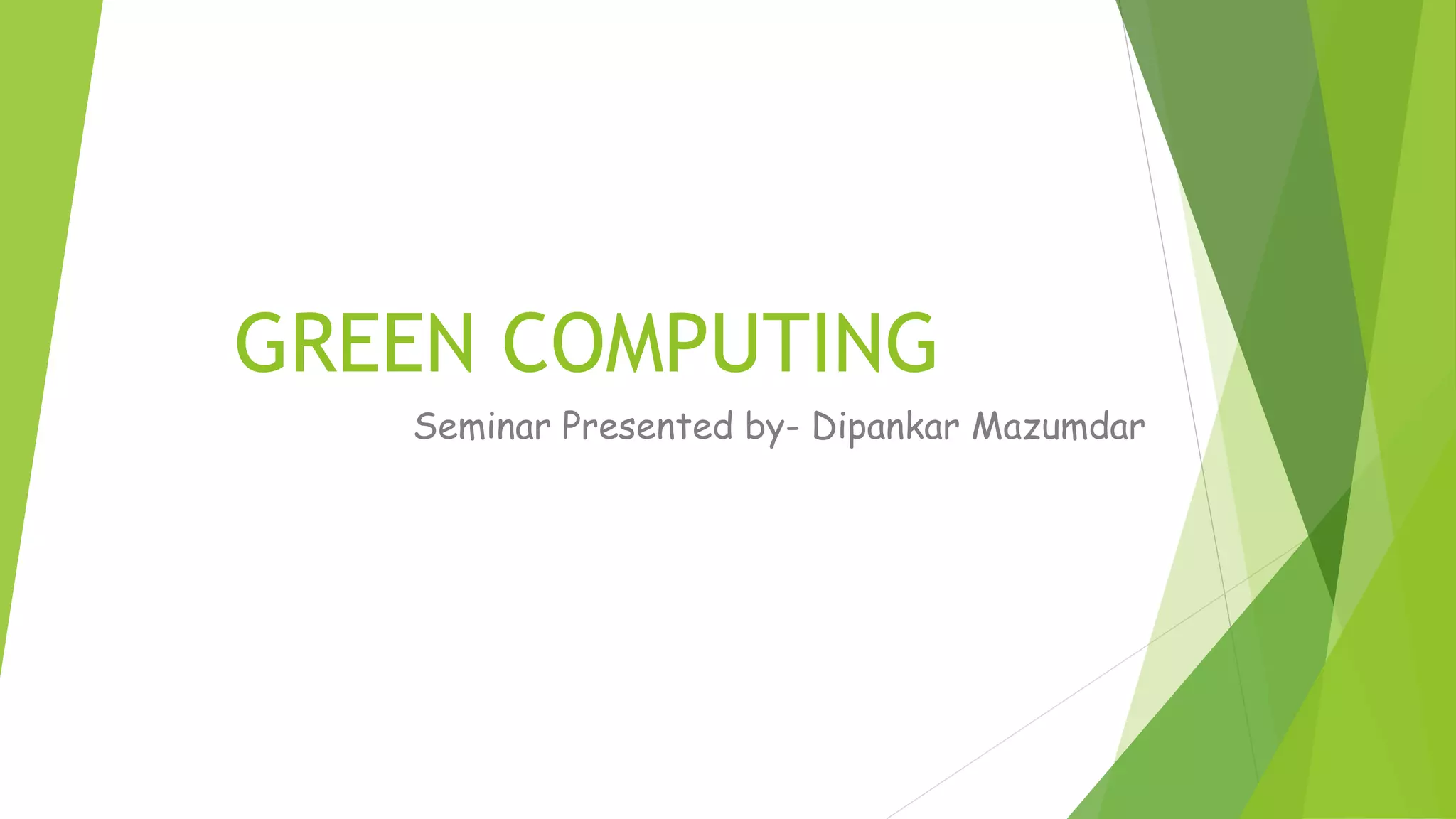 The document presents a seminar on green computing, defined as the efficient use of computer resources with minimal environmental impact through practices like reducing hazardous materials and energy consumption. It emphasizes the importance of green manufacturing, energy efficiency programs like Energy Star, and strategies for prolonging equipment lifespan, optimizing software, and promoting recycling. Additionally, it discusses methods for conserving energy during computer usage, such as using sleep or hibernate modes, and advocates for responsible disposal through reusing, refurbishing, and recycling components.