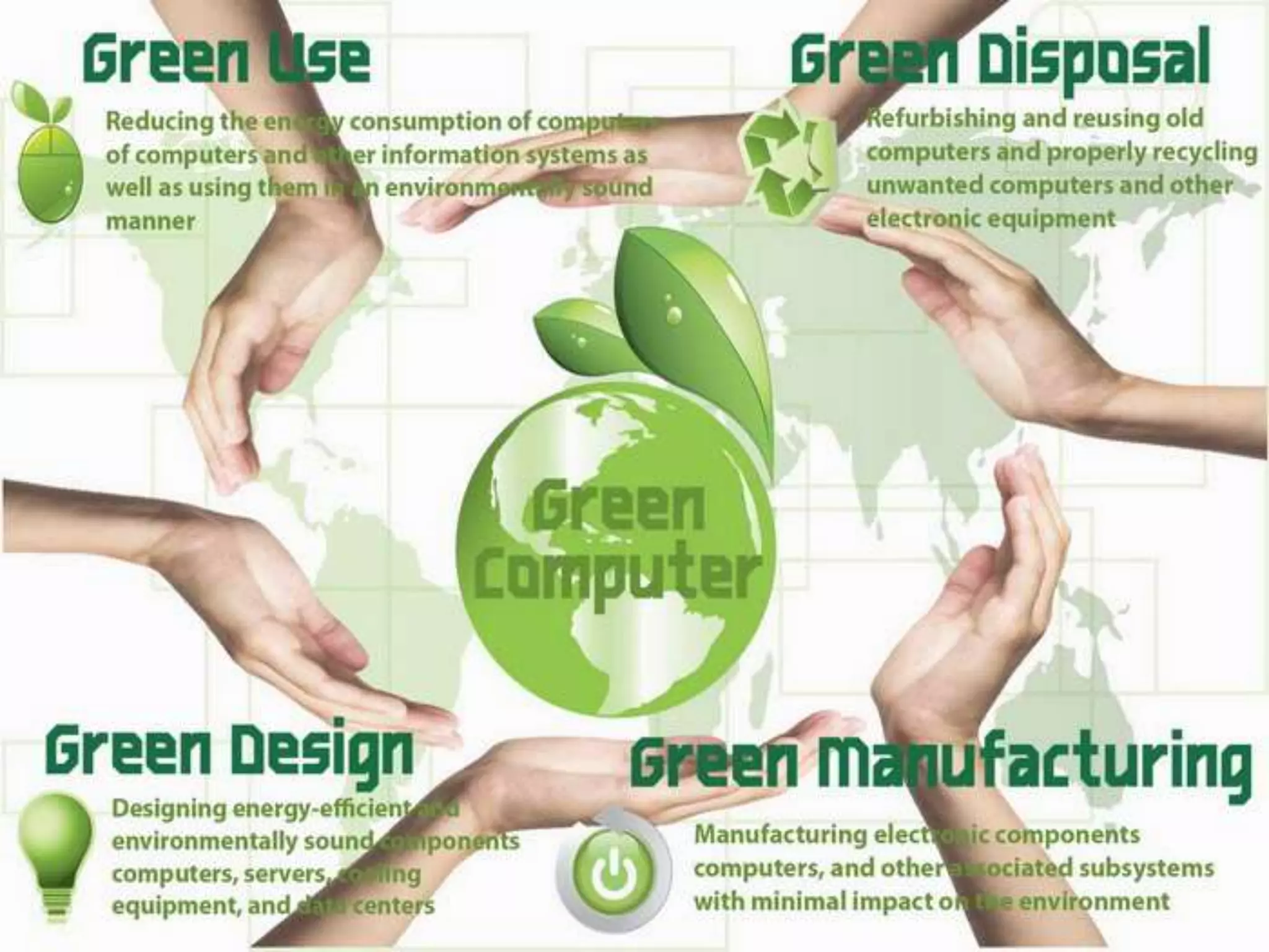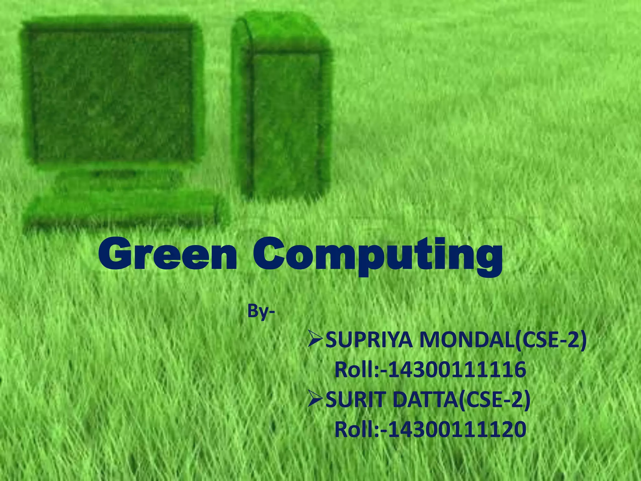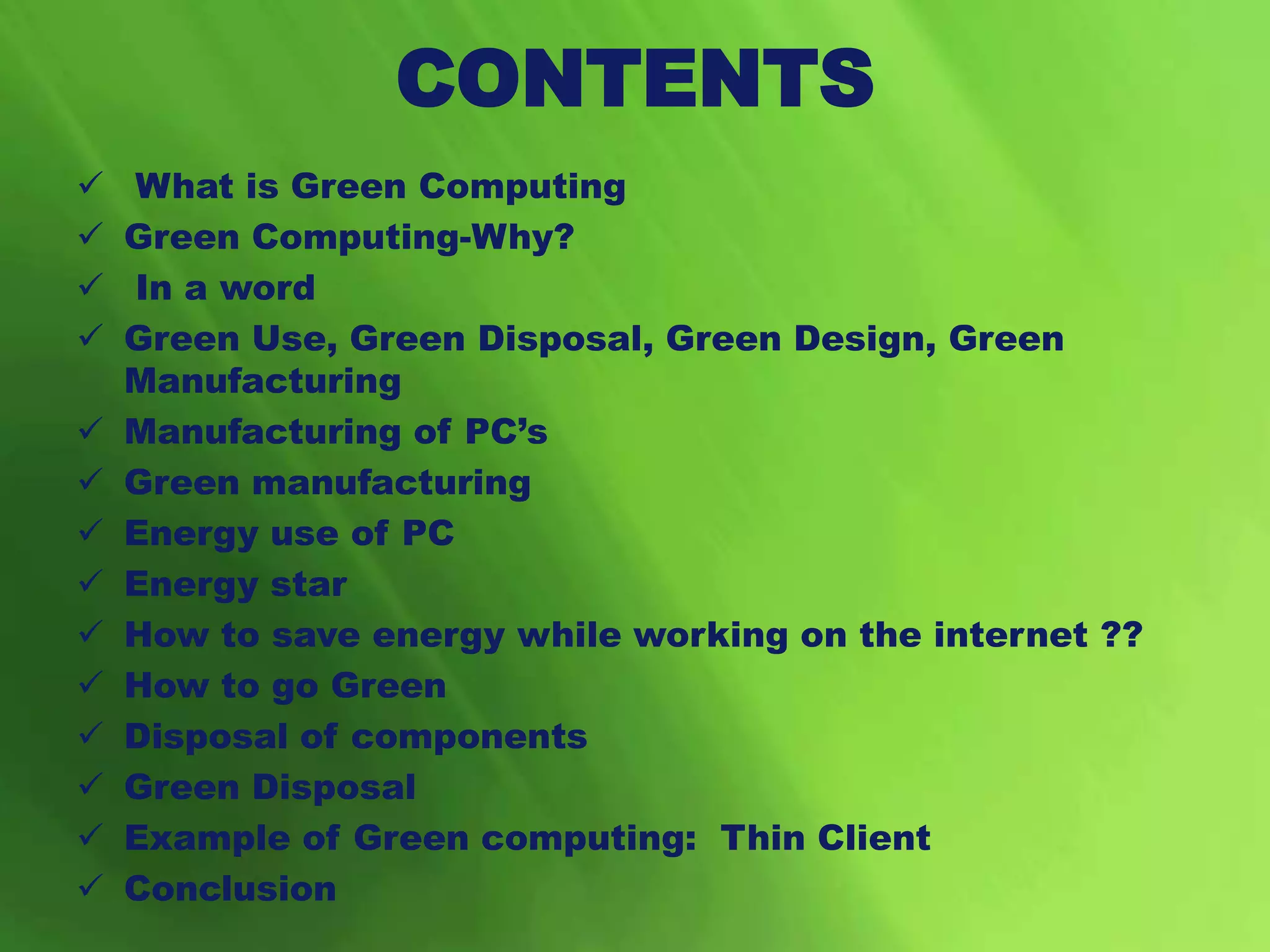 Green computing aims to reduce the environmental impact of computers and their use. It promotes energy efficient and environmentally friendly computing practices like using energy efficient CPUs and servers, implementing power management features, and properly disposing of or recycling electronic waste. Common components in computers like lead, mercury, and cadmium can be toxic, so green manufacturing seeks to reduce pollution and use of hazardous materials. Adopting practices like using energy star certified devices, enabling power saving modes, recycling electronics, and opting for thin clients can help make computing more environmentally friendly.
