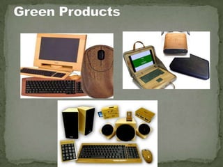 The document discusses green computing, which aims to reduce the environmental impact of computing through more efficient use of computing resources and reducing pollution from manufacturing and disposal of electronics. It notes that computers use a lot of energy and lists ways to reduce energy usage such as using power saving modes, turning off monitors and computers when not in use, and choosing more efficient LCD monitors over older CRT monitors. The document also discusses reducing hazardous materials used in manufacturing and better disposal and recycling of electronics to reduce pollution and toxicity.