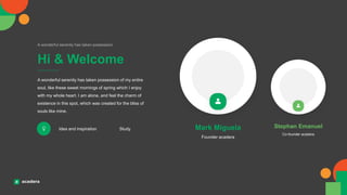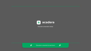 This presentation outlines Acadera, an education company founded by Mark Miguela and Stephan Emanuel. It discusses Acadera's vision of providing educational opportunities to help students achieve their dreams. The presentation covers Acadera's offerings, including various degree programs, lecturers, courses, and facilities. It also provides statistics on Acadera's student enrollment and achievements. Mockups of a proposed new e-learning platform are presented, along with charts showing Acadera's performance data and growth projections. The presentation concludes by thanking the audience.