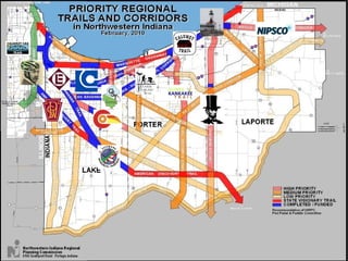 The ASCE reports a $2.2 trillion infrastructure maintenance shortfall in the U.S., with significant updates on local trail developments and the complete streets initiative aimed at accommodating diverse transportation users. A total of 600+ miles of shared routes exist, with plans for extensive trail networks and water trails identified in Indiana. Key stakeholders include various local and national associations, emphasizing collaboration for improved regional infrastructure.