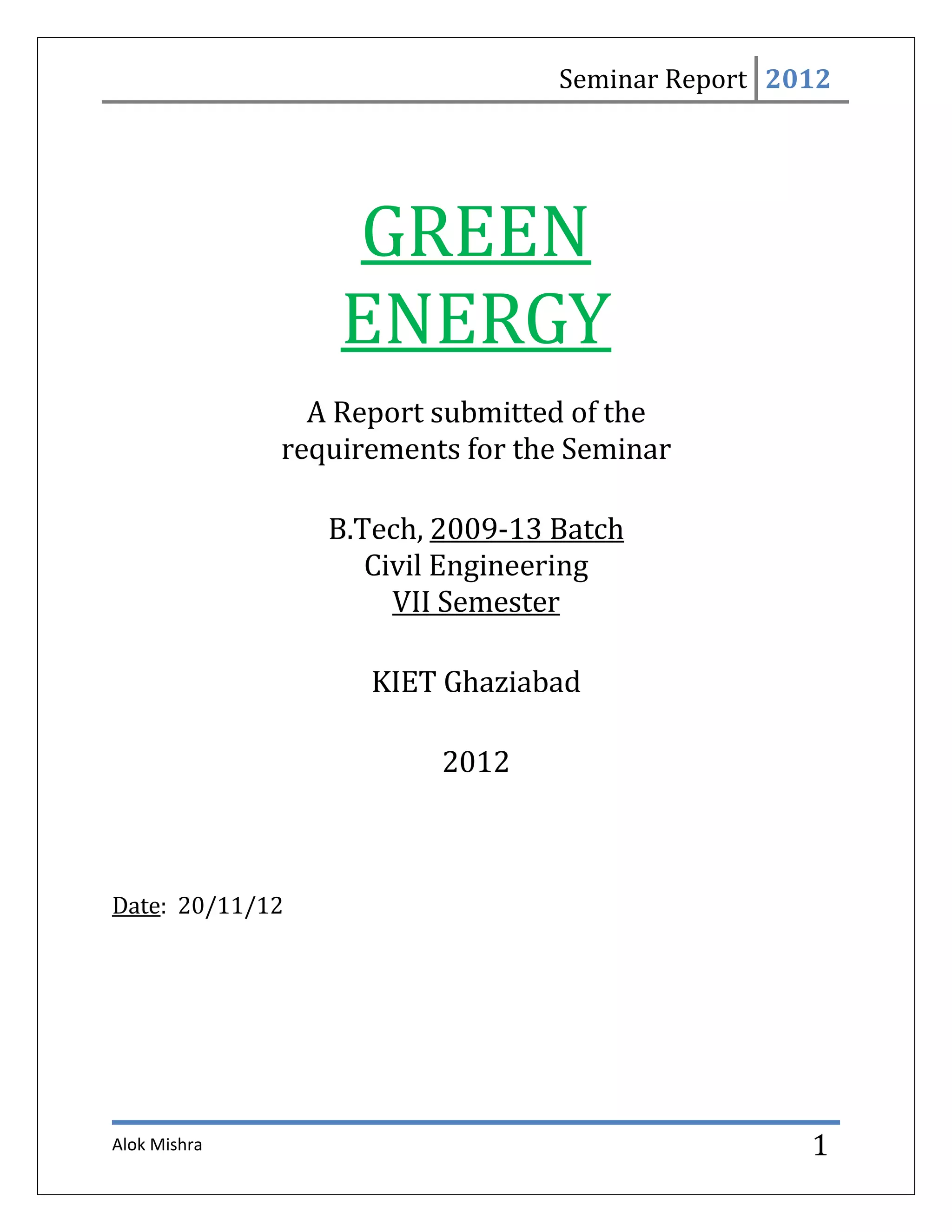 The document is a seminar report on green energy that discusses various renewable energy sources including biomass energy. It provides an overview of green energy and why it is important to use. It then discusses biomass energy in detail. Biomass energy is the conversion of organic material from plants and crops into useful forms of energy. It notes that biomass was the first energy source harnessed by humans. While biomass accounts for a large portion of energy in developing countries, modernized biomass technologies can help biomass play a more significant role worldwide in a cleaner, more efficient manner.