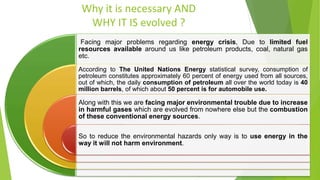 The document discusses the "Green engine", a new type of internal combustion engine designed to reduce emissions and increase efficiency. It has several modifications from conventional engines, including a design with rotors and vanes that allows for more complete combustion. The Green engine produces near-zero emissions, is small and lightweight, can run on multiple fuel types, and has high efficiency. It could be applied in vehicles, generators, and other machinery to provide cleaner and more sustainable power.