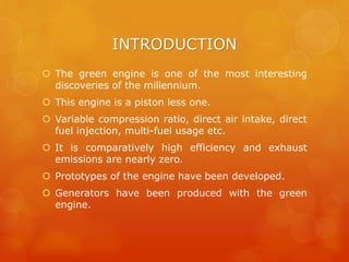 The green engine is a pistonless internal combustion engine, featuring high efficiency and near-zero exhaust emissions, designed to address current energy crises and environmental concerns. It operates through six phases: intake, compression, mixing, combustion, power, and exhaust, utilizing a modular design and direct air and fuel intake. Prototypes have been developed, showcasing its advantages like multi-fuel capability and smooth operation, though limitations are yet to be fully determined.