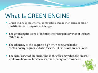 The document discusses the green engine, which is an internal combustion engine modified to increase efficiency and reduce emissions. It notes that green engines are more efficient than contemporary engines and produce near-zero exhaust emissions. This makes them significant given current energy and environmental challenges. The document outlines the need to invent green engines to address issues like energy crisis and harmful gas emissions from conventional engines. It provides details on green engine working, technical features, advantages, examples of different green engine applications, and concludes that green engines will help serve the purpose of addressing current energy and environmental problems, even if some limitations remain unknown.