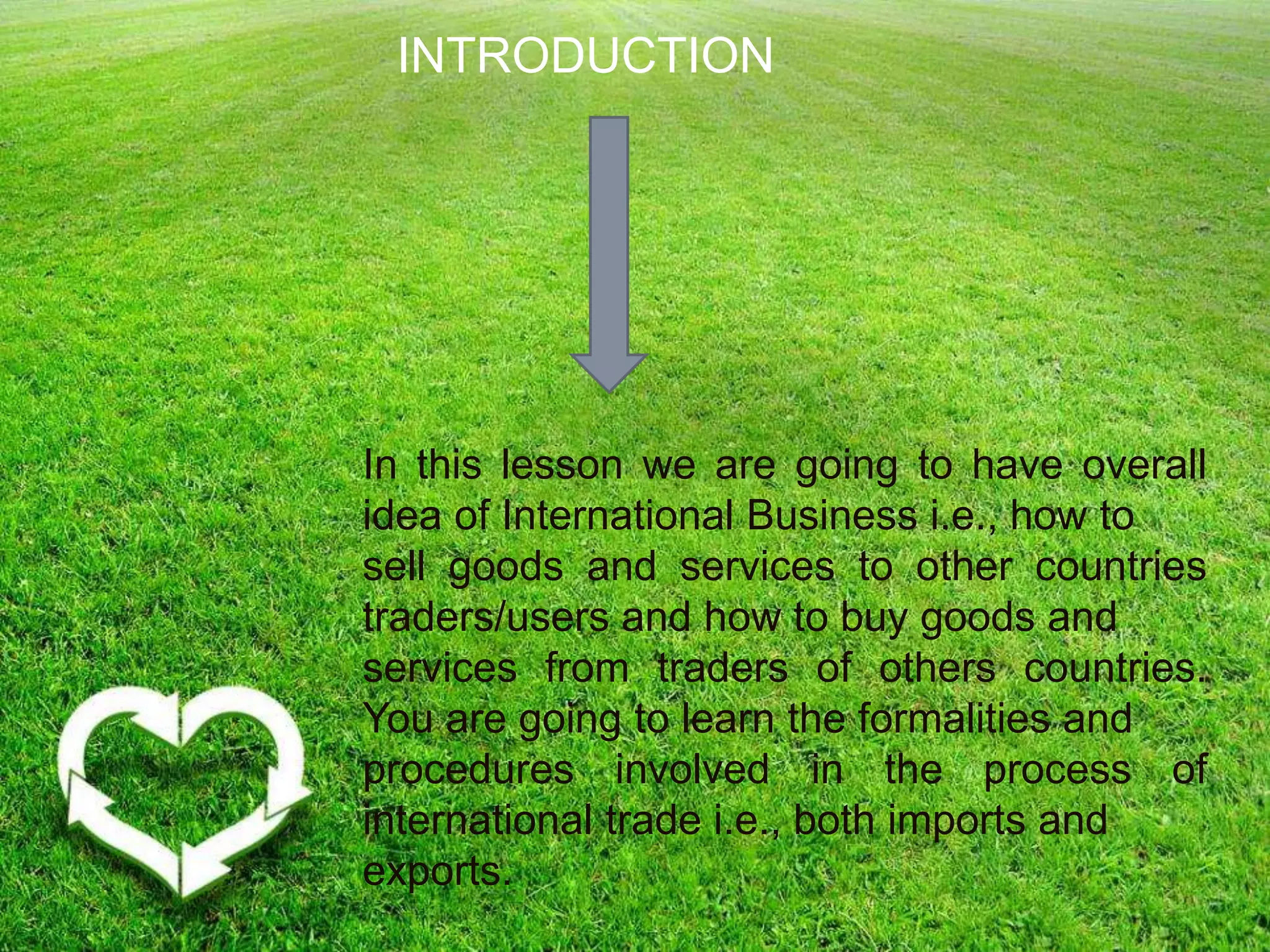 This document provides an overview of international business, including importing and exporting goods between countries. It discusses the meaning of international business, benefits to nations and firms, and procedures for both exporting and importing goods. The key steps in exporting include obtaining necessary licenses, shipping goods, completing customs clearance, and sending documents to the importer. Importing procedures involve gathering supplier information, obtaining import licenses, paying in foreign currency, receiving shipped goods, and clearing customs.