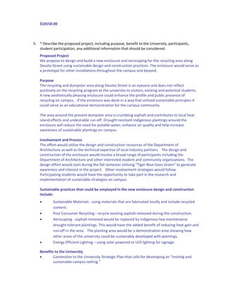 The proposal requests $18,150 to design and construct a sustainable recycling enclosure and xeriscaping area on Desoto Street that would serve as a prototype for future campus projects. The current dumpster area is an eyesore that does not reflect positively on the university's recycling efforts. The new enclosure would utilize sustainable materials and practices like drought-resistant native plantings, recycled content, and solar lighting. It would provide educational benefits to involve students in researching and implementing sustainability strategies. The project aims to enhance the campus environment and connect it to the university's strategic plan of developing a sustainable setting.
