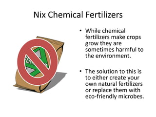 The document discusses sustainable alternatives to chemical fertilizers, highlighting Sumagrow's natural soil products that enhance crop yields and soil health. It addresses the destruction of coral reefs and introduces the Biorock technique, which uses electricity to accelerate coral growth. Additionally, it presents the Bosco Verticale project in Milan, a vertical forest building designed to promote urban biodiversity and sustainability.