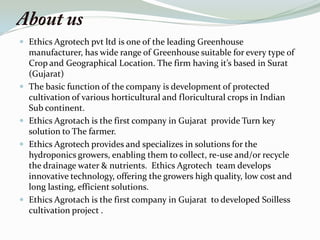Ethics Agrotech is a leading greenhouse manufacturer in Gujarat, India. It provides turnkey greenhouse solutions for horticultural and floricultural crops using protected cultivation techniques. Ethics Agrotech specializes in hydroponics and soilless cultivation systems that allow farmers to reuse and recycle nutrients. It was the first company in Gujarat to develop soilless cultivation projects and provide full farming solutions to farmers to increase production through innovative technology and quality products.