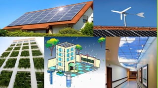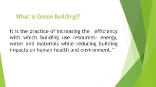 The document discusses the concept of green building. It defines green building as increasing efficiency in resource use like energy, water, and materials while reducing environmental impacts. Green buildings are important because they use fewer resources and create less waste, making them healthier and more sustainable. Examples of green building techniques given include solar energy cells, green spaces, rainwater harvesting, and using sustainable materials like wool bricks and solar tiles. The benefits of green building are described as environmental, economic, and social.